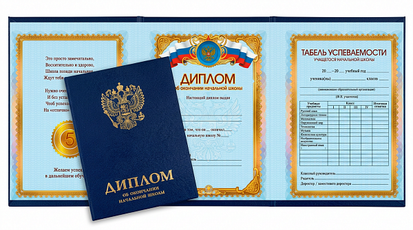 Диплом выполнен в благородной синей цветовой гамме. Строгое золотое тиснение заголовка и герба придает документу официальность и значимость, подчеркивая важность момента.