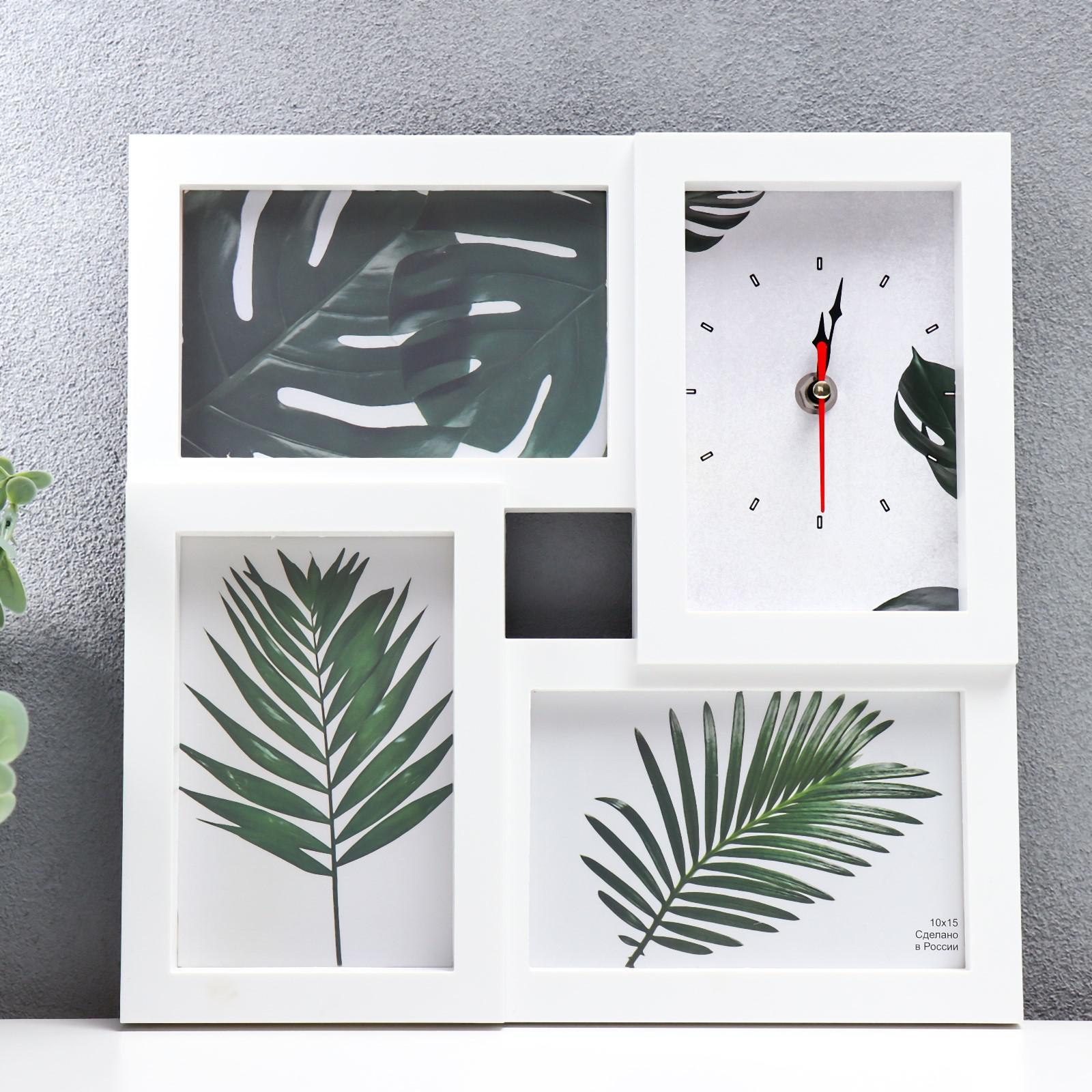 Легкий, прочный фотоколлаж для семьи с 3 фоторамками 10х15 см. Тип питания для часов - 1 пальчиковая батарейка АА, в комплект не входит.