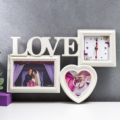 Легкий, прочный фотоколлаж для семьи с 3 фоторамками 10х15 см, 1 фоторамкой 9х9 см и 1 фоторамкой в виде сердца. Тип питания для часов - 1 пальчиковая батарейка АА, в комплект не входит.