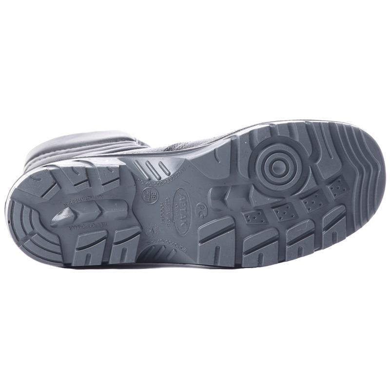 Подошва: ПУ-ТПУ (двухслойная: внутренний слой из облегченного амортизирующего полиуретана, ходовой слой из износостойкого термопластичного полиуретана), маслобензостойкая (МБС), кислотощелочестойкая (КЩС), термостойкая (до +150°C/+160°C), морозостойкая (до -30°C), с самоочищающимся протектором глубиной 4.5-5.0 мм, эффективно препятствующим скольжению