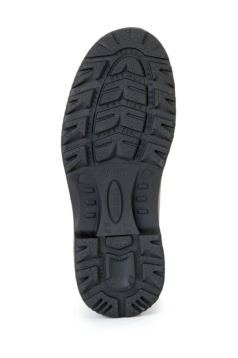 • Подошва: ПУ-Нитрил, двухслойная — внутренний слой амортизирующий полиуретан, ходовой слой из нитрильной резины. Защищает от кратковременного контакта с нагретыми поверхностями (до +300°С) и агрессивных сред (МБС, КЩС). Протектор глубиной 4,0-4,5 мм эффективно препятствует скольжению, морозостойкость подошвы до -45 °С