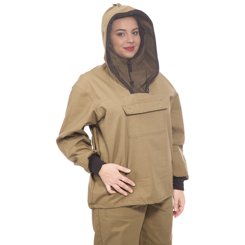 — куртка прямого силуэта с капюшоном со съёмной вставкой из противомоскитной сетки на молнии, на груди накладной карман с клапаном, застёгивающимся на петли и пуговицы, рукава с трикотажными напульсниками, низ куртки на эластичной резинке с фиксатором;