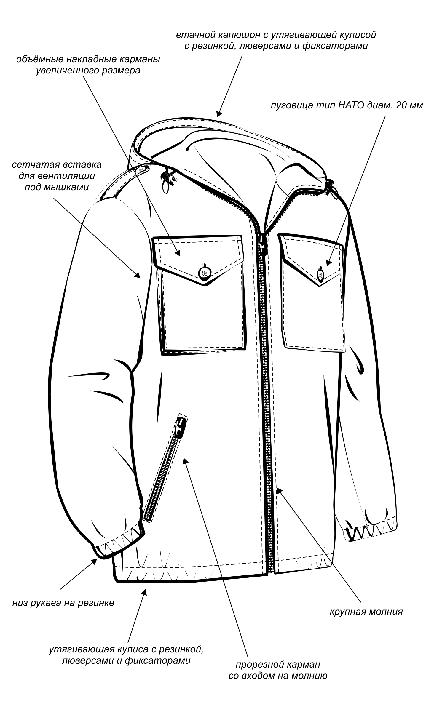 — имеется капюшон со шляпной резинкой, который регулируется высоте и объёму.