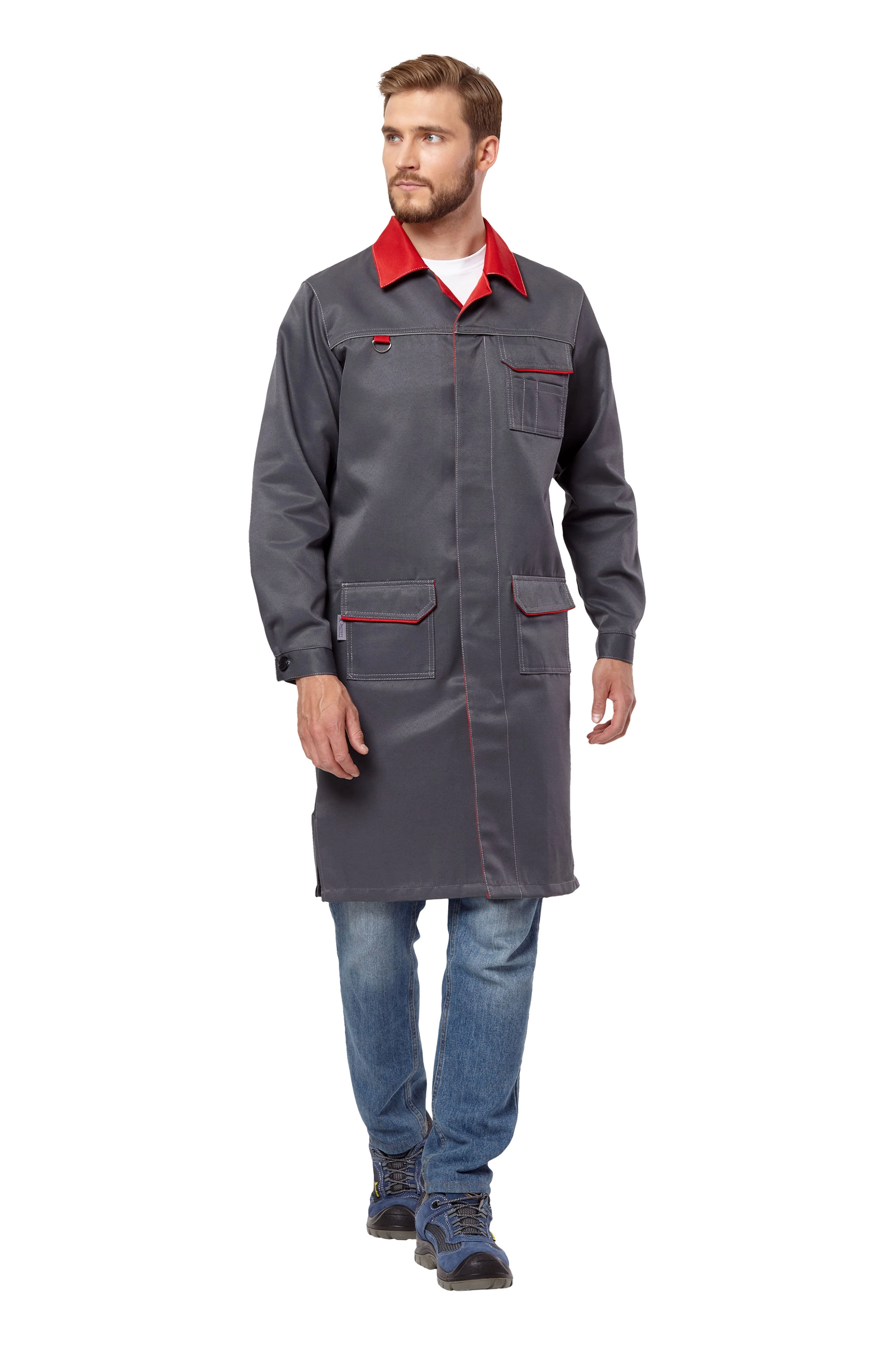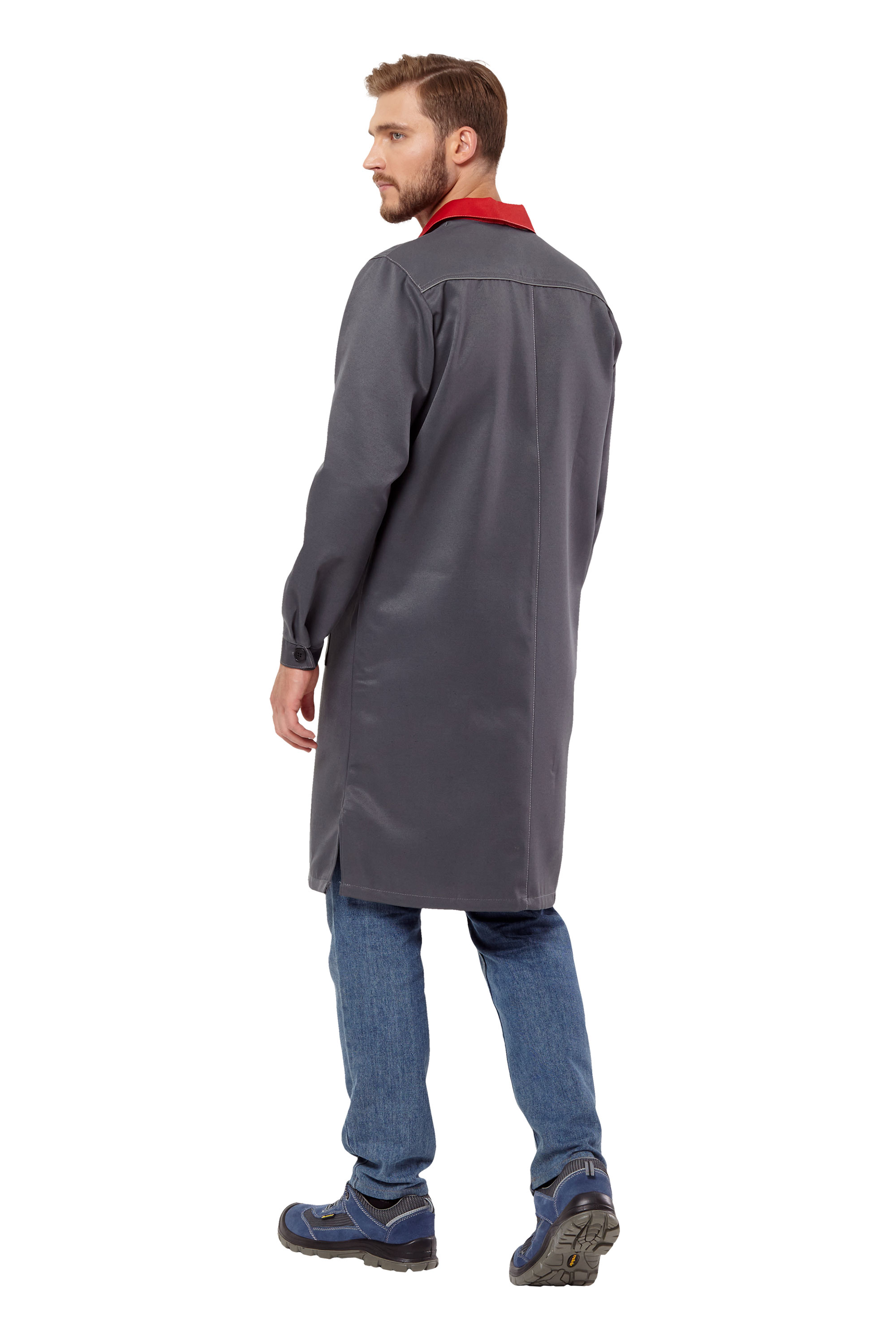 — халат прямого силуэта, с длинными рукавами с манжетами, застёгивающимися на пуговицу, с отложным воротником;