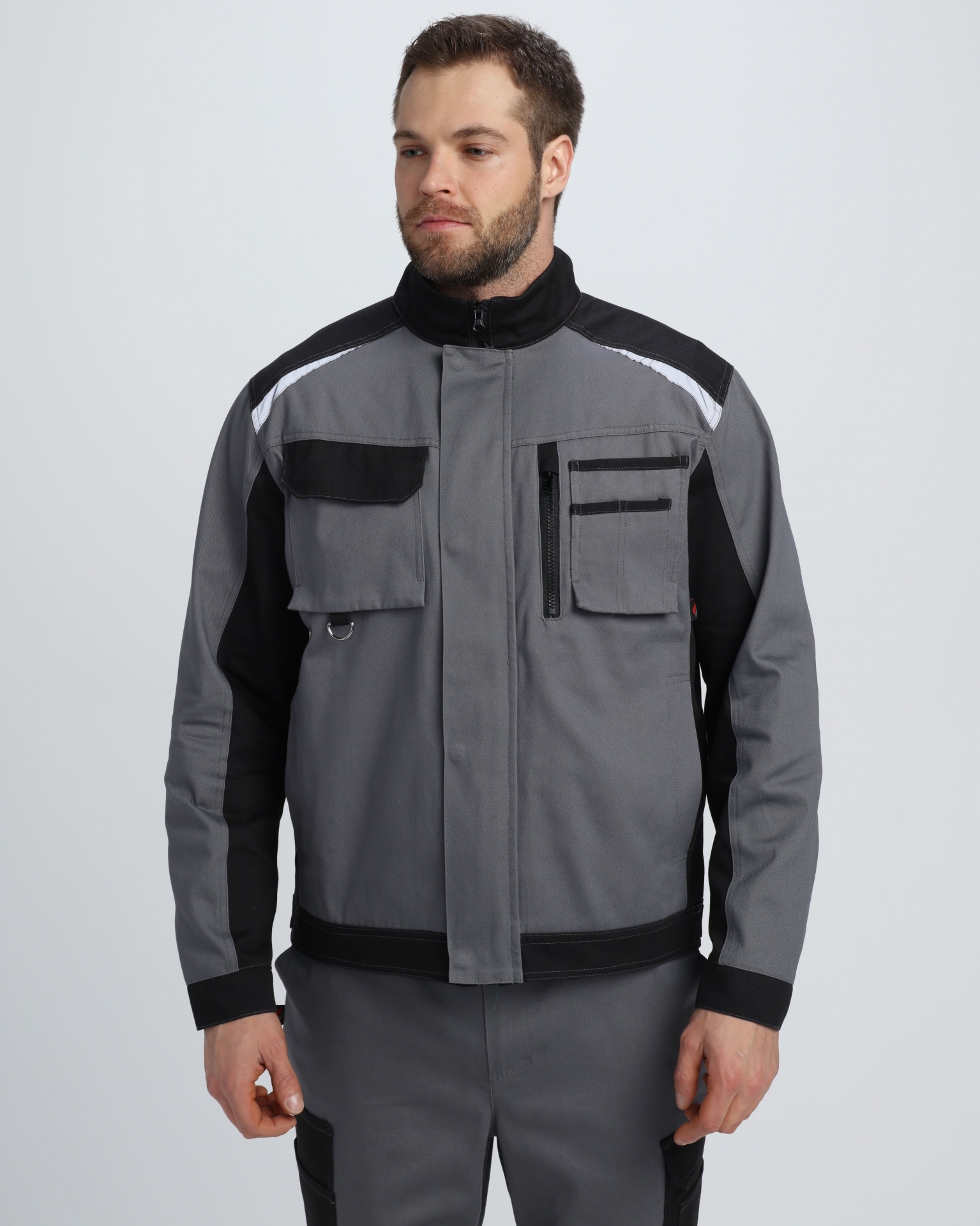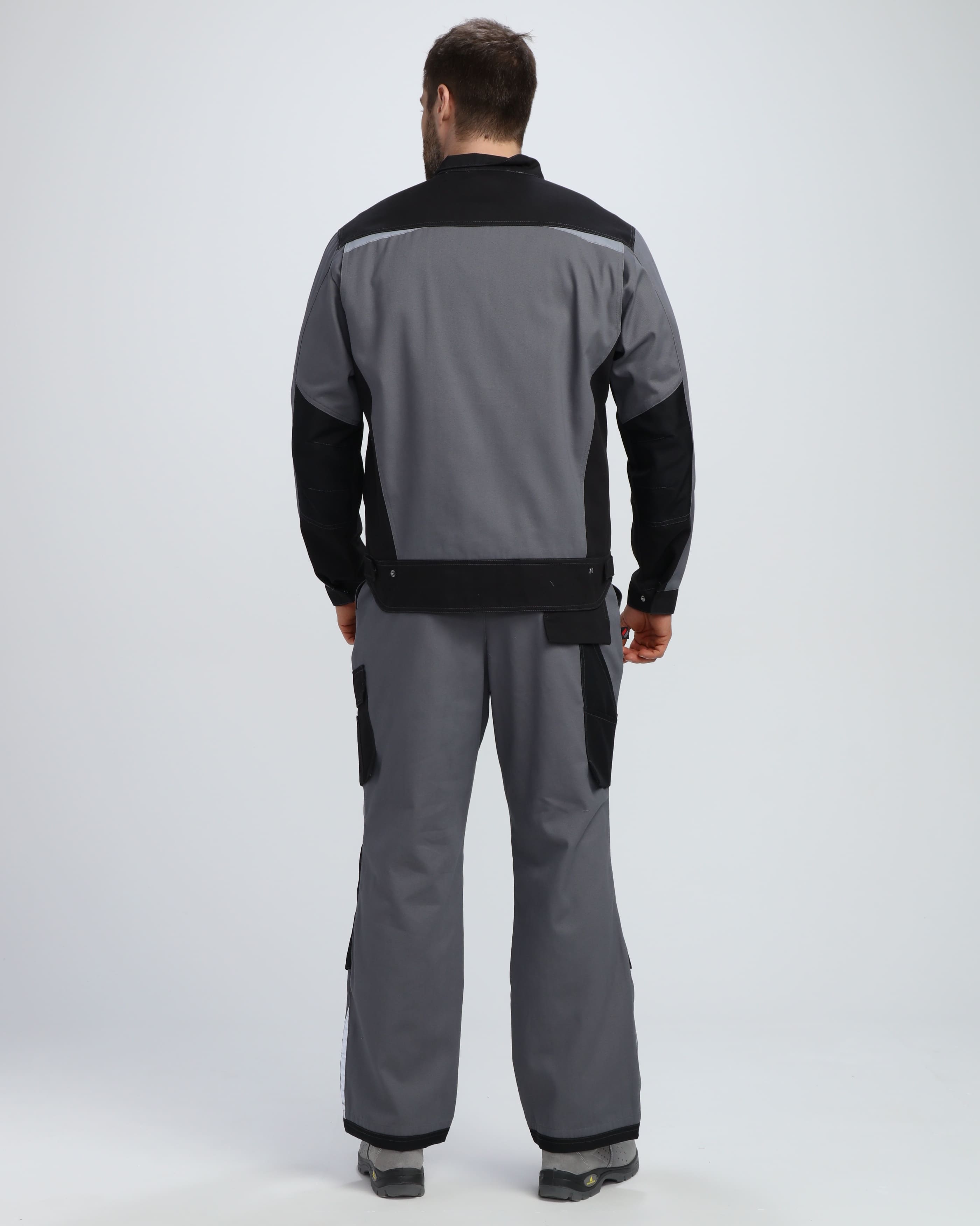 Куртка: с центральной застежкой на молнию и дополнительной ветрозащитной планкой на потайных кнопках; вентиляционные отверстия для оптимального воздухообмена; функциональные карманы, включая накладной нагрудный с держателем на металлическом полукольце для инструментов; складки в проймах спинки и паты на поясе для свободы движений.