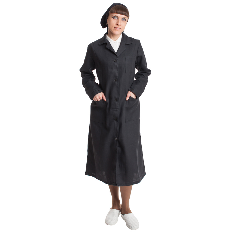 — халат полуприлегающего силуэта с центральной бортовой застёжкой на петли и пуговицы;
