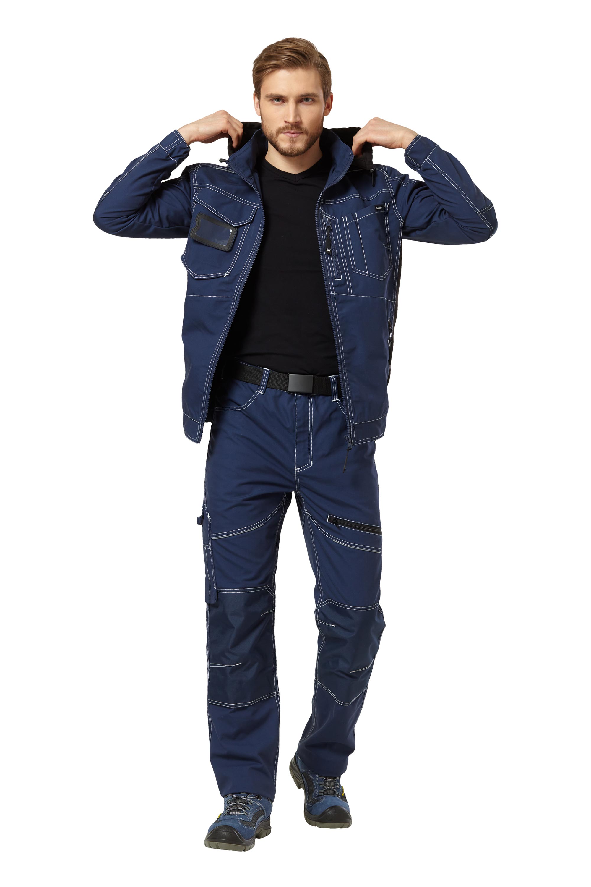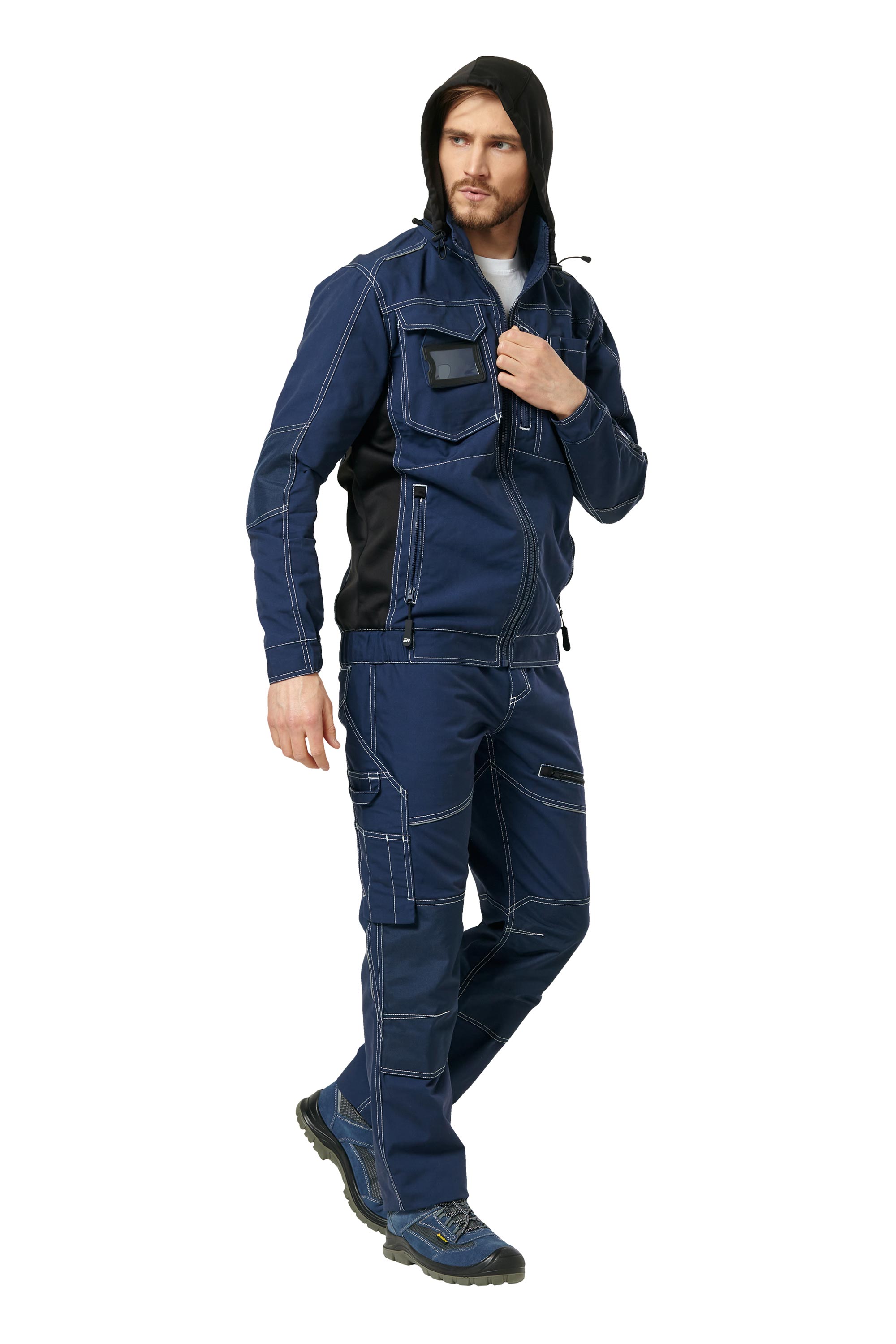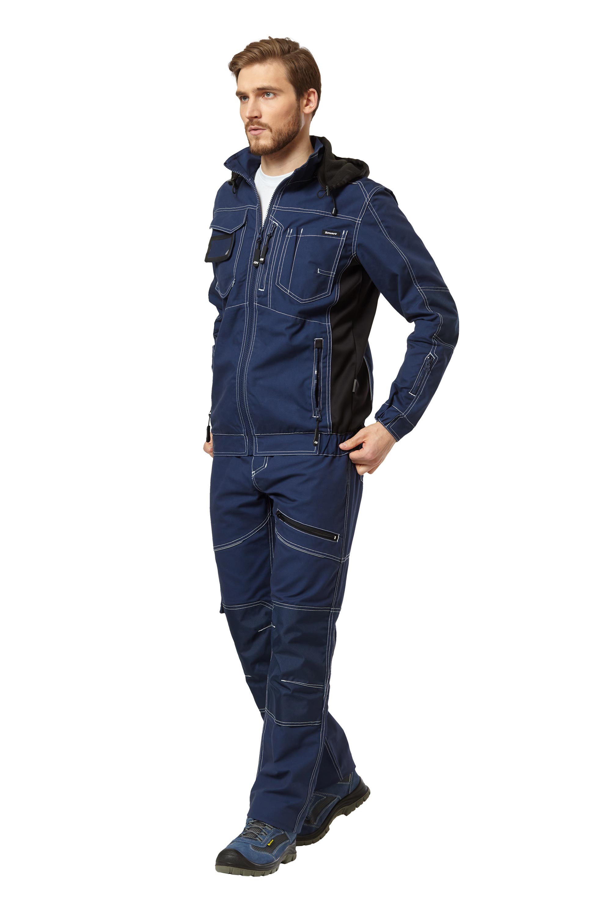Куртка летняя и демисезонная из прочной смесовой ткани темно-синего цвета, с отделкой из эластичной ткани Софтшелл черного цвета, для защиты от общих производственных загрязнений.
