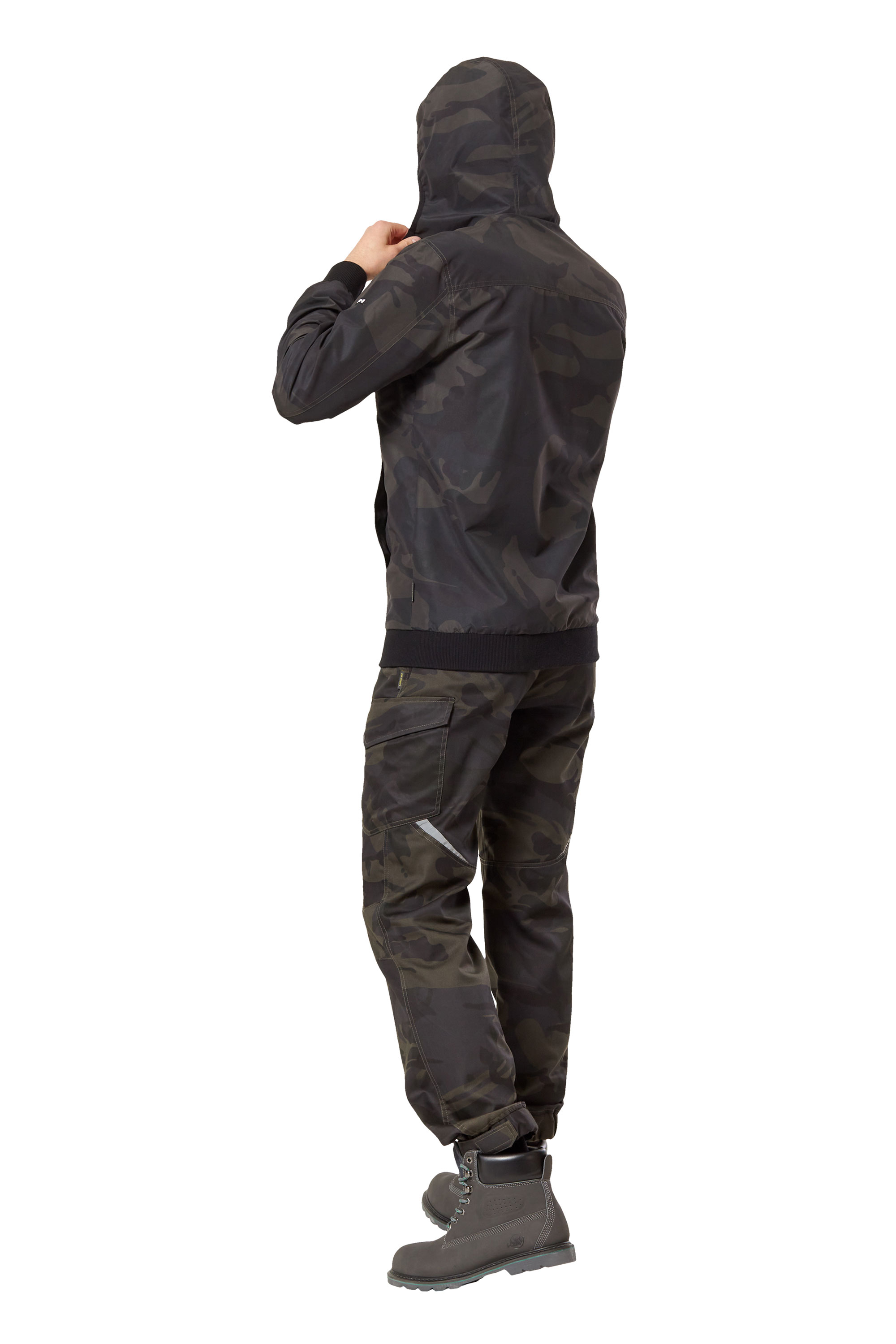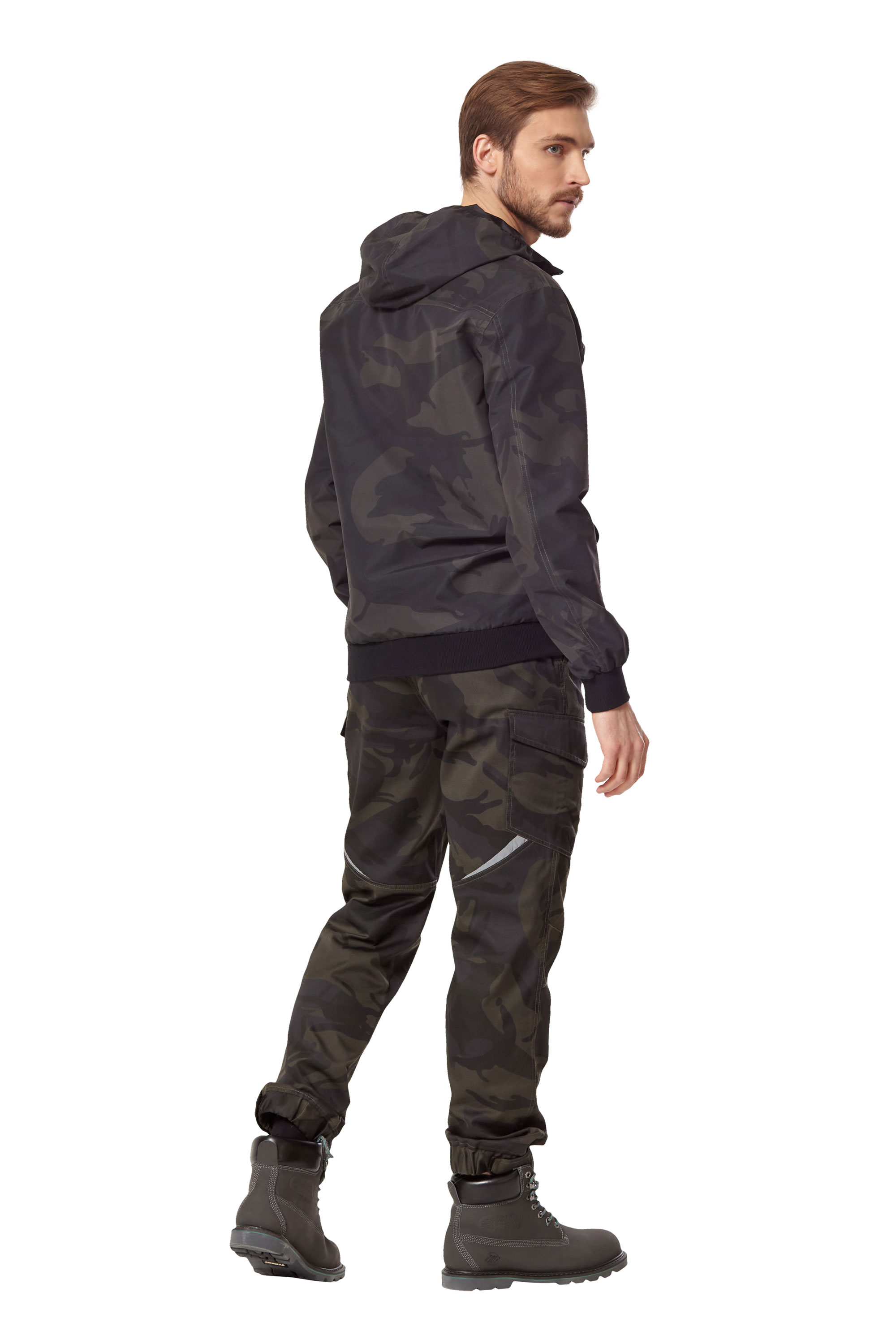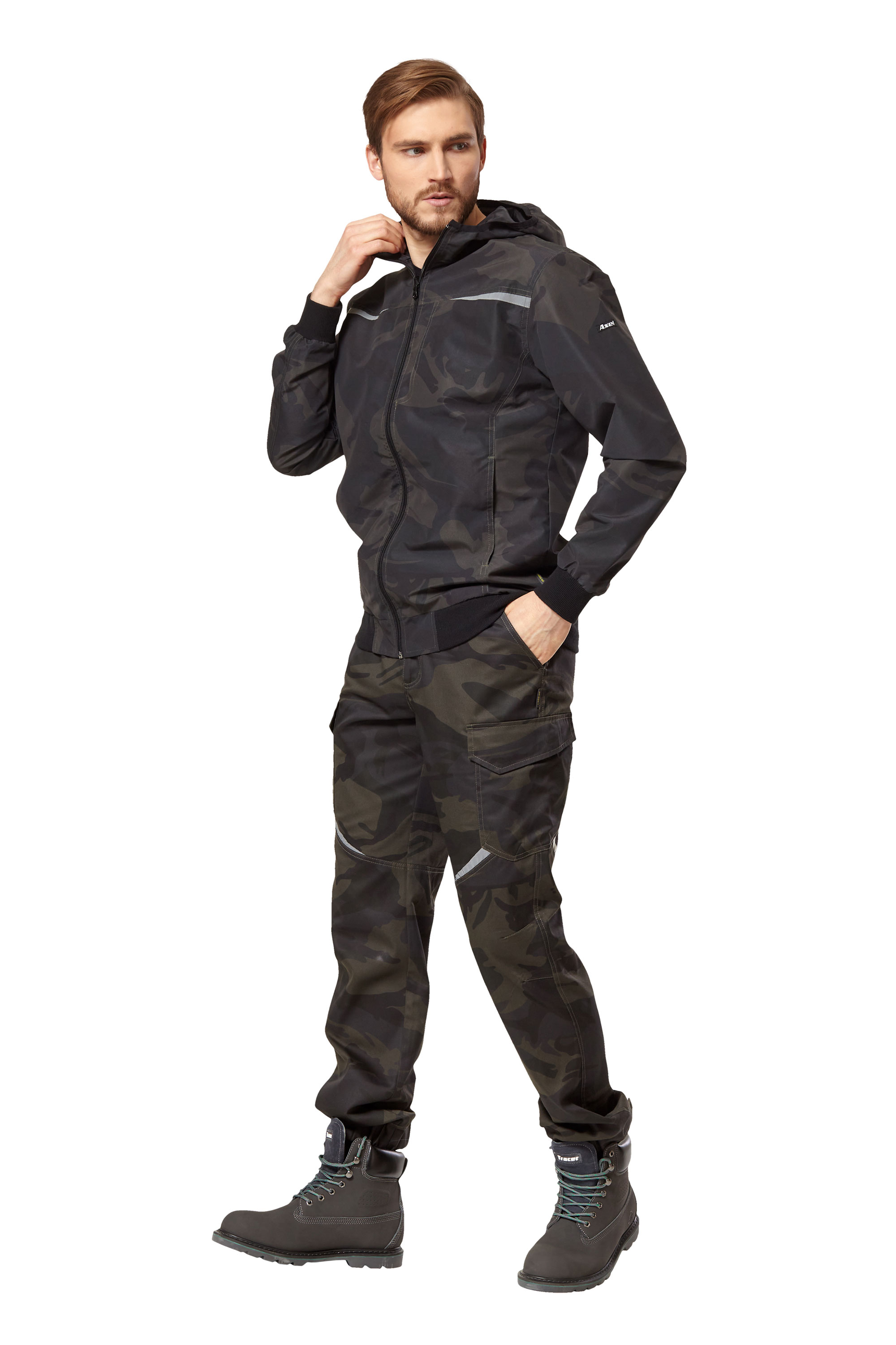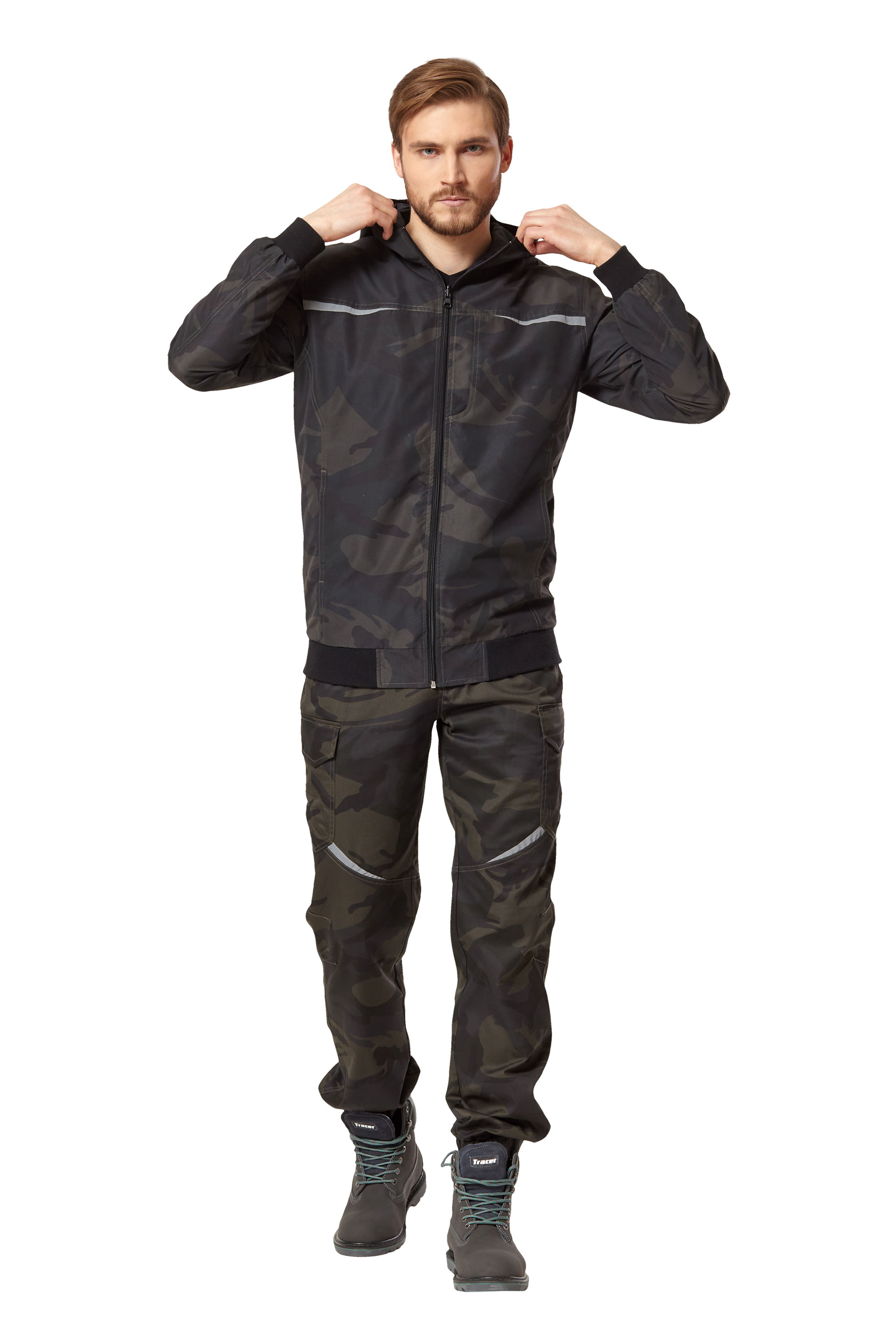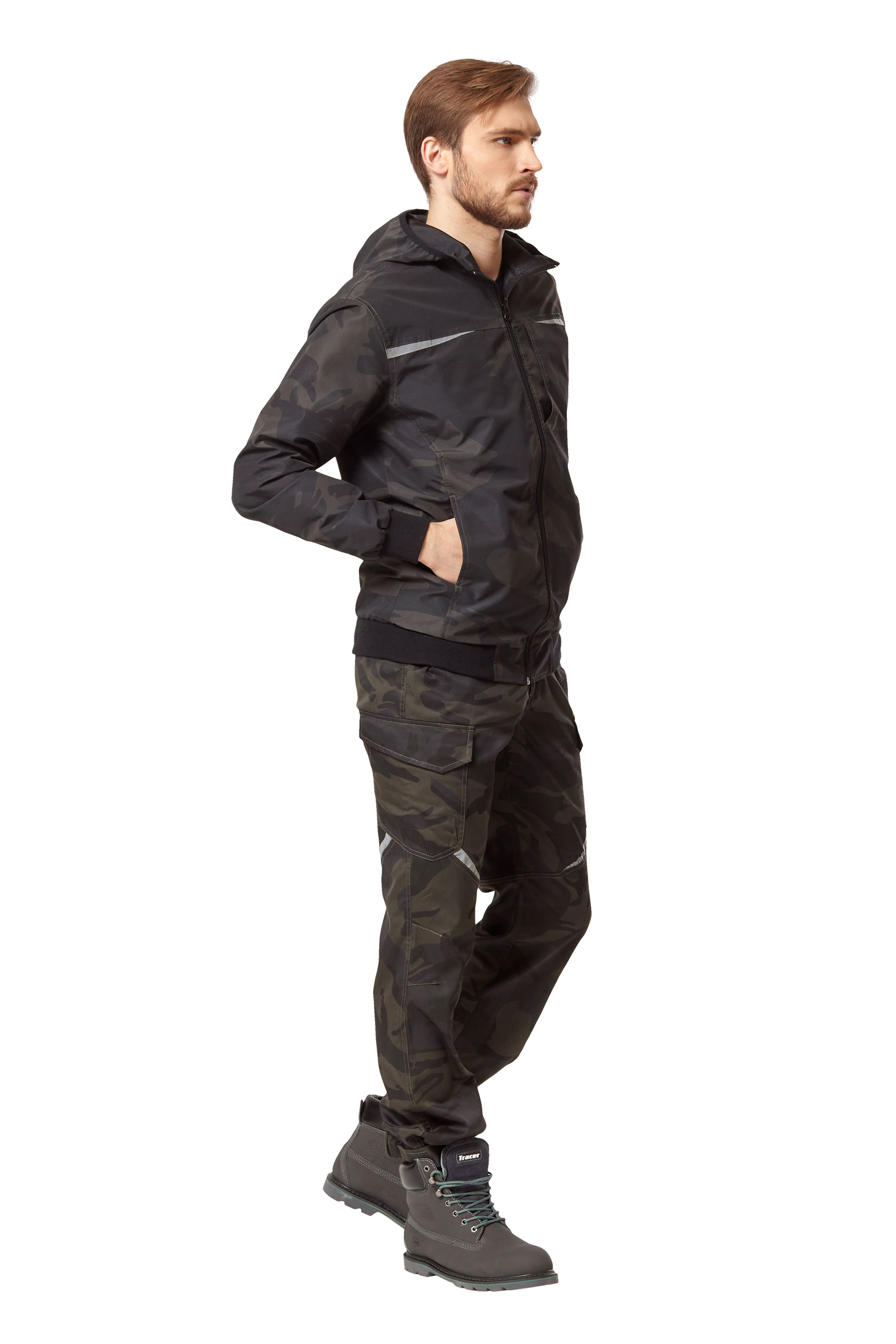 Двухсторонняя куртка-ветровка летняя и демисезонная из синтетической ткани: внешняя сторона - камуфлированная цвета хаки, внутренняя сторона - черного цвета, для защиты от общих производственных загрязнений.