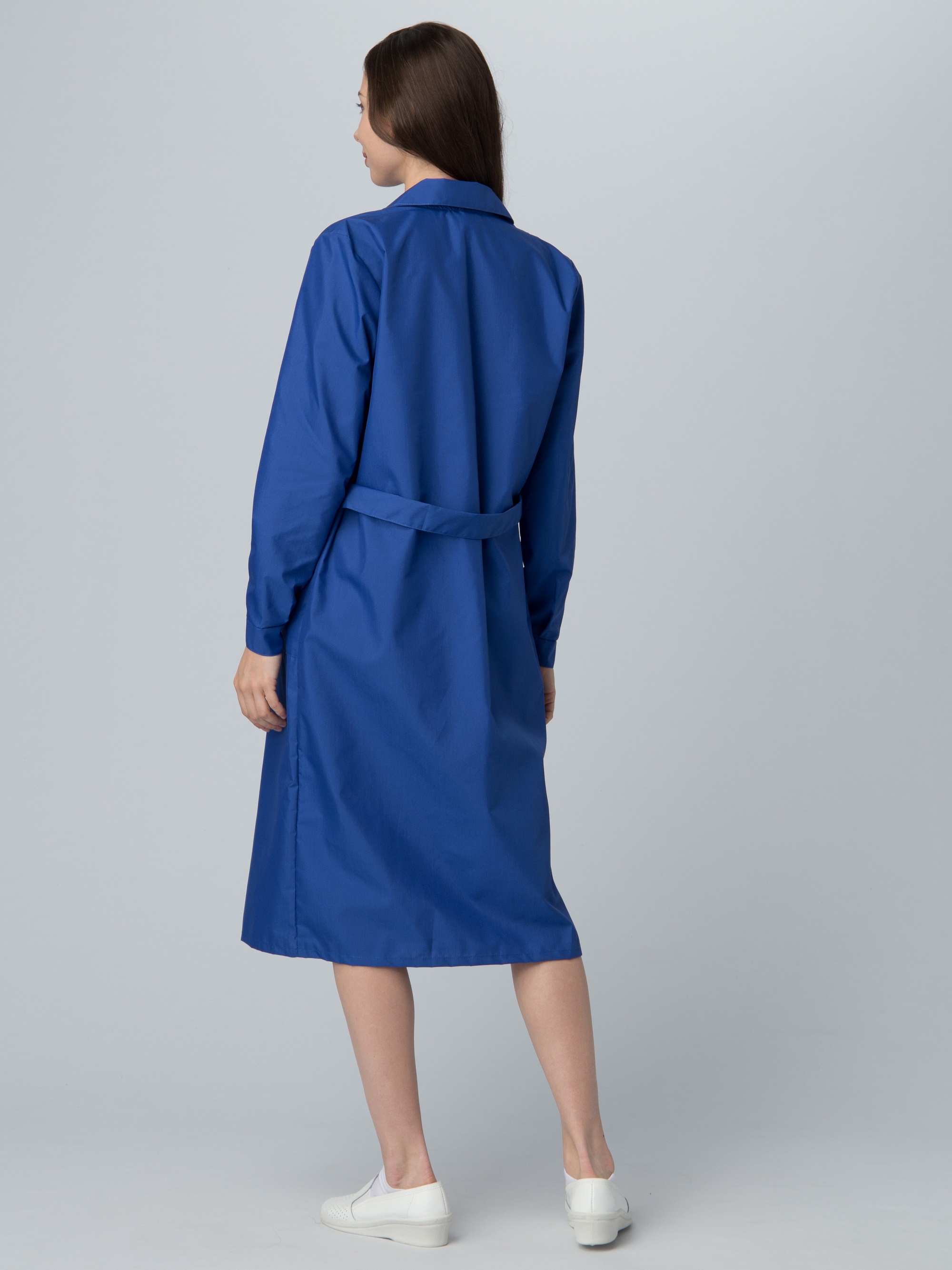 Халат прямого силуэта, длина ниже колена. Центральная застежка на пуговицы (открытая). Втачной длинный рукав с манжетами на петле/пуговице. Отложной «английский» воротник. Боковые вместительные карманы и нагрудный уменьшенный карман. Регулировка объема по талии вшивным поясом на пуговице.