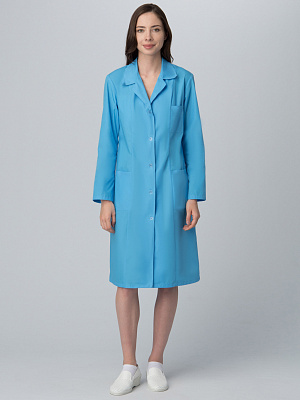 Халат полуприлегающего силуэта. Центральная застежка на кнопках. U-образный вырез горловины. Рукав 3/4. Боковые накладные карманы. Регулировка объема по талии с помощью притачного пояса. Декоративный кант контрастного (голубого) цвета по кокетке и рукавам.