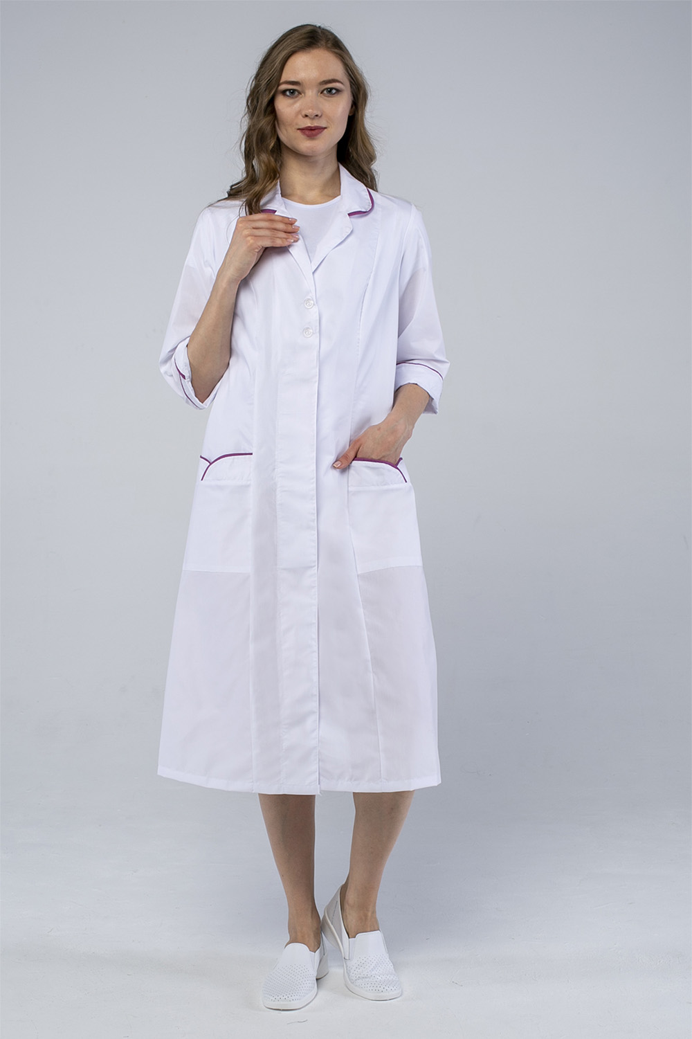 Халат прямого силуэта, длина ниже колена. Центральная супатная застежка (петли/пуговицы) с планкой. Втачной рукав ¾ с отложной фигурной манжетой. U-образный вырез воротника. Боковые вместительные карманы. Регулировка объема по талии вшивным поясом на пуговицу. Контрастный двухцветный кант по краям карманов, рукавов и воротника.
