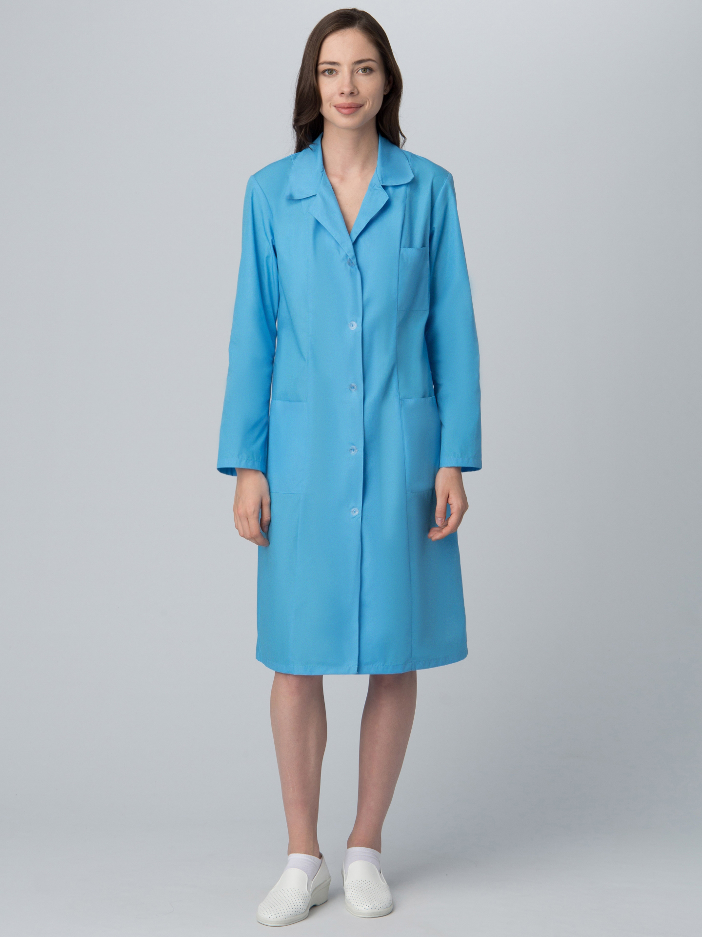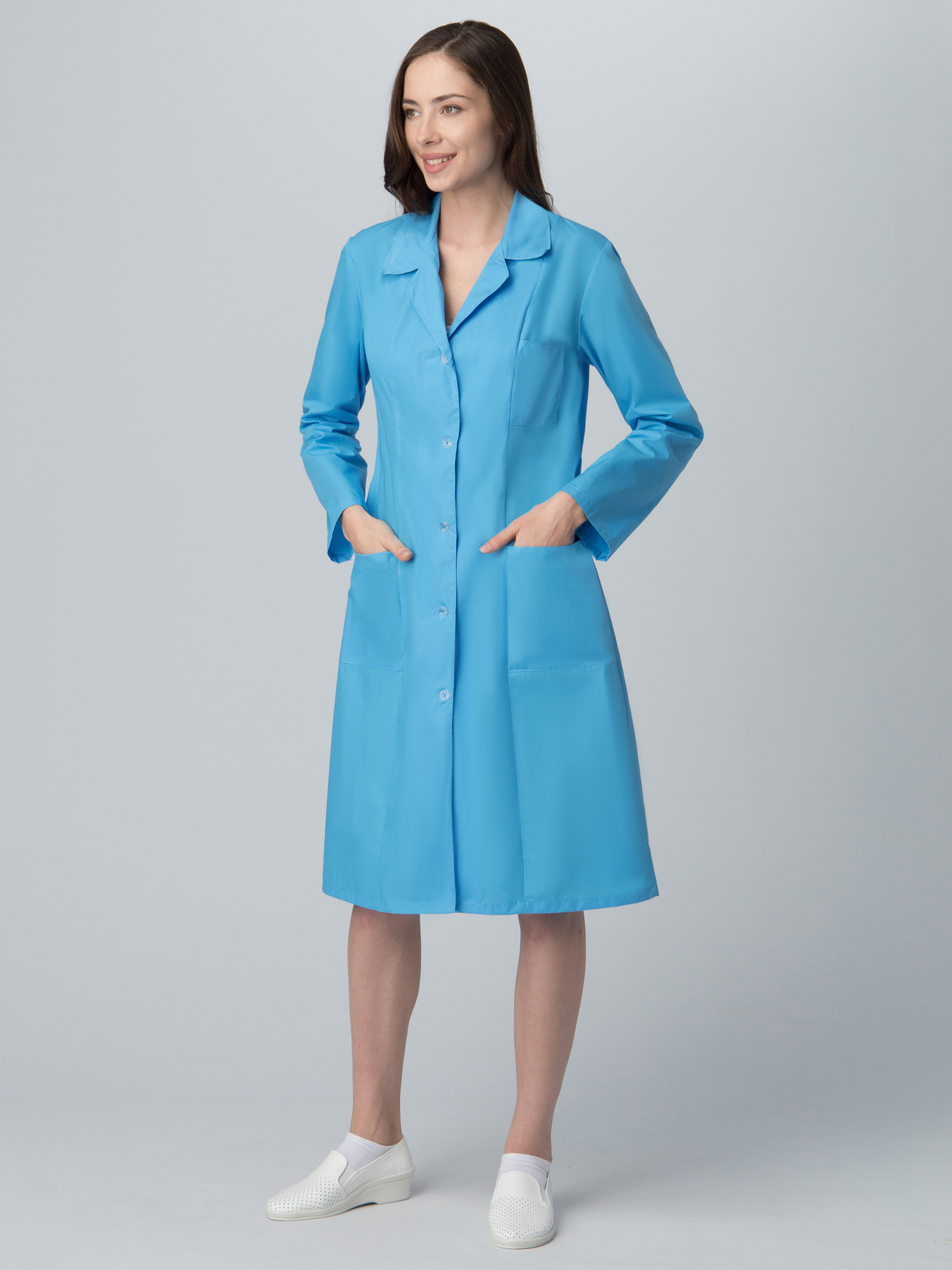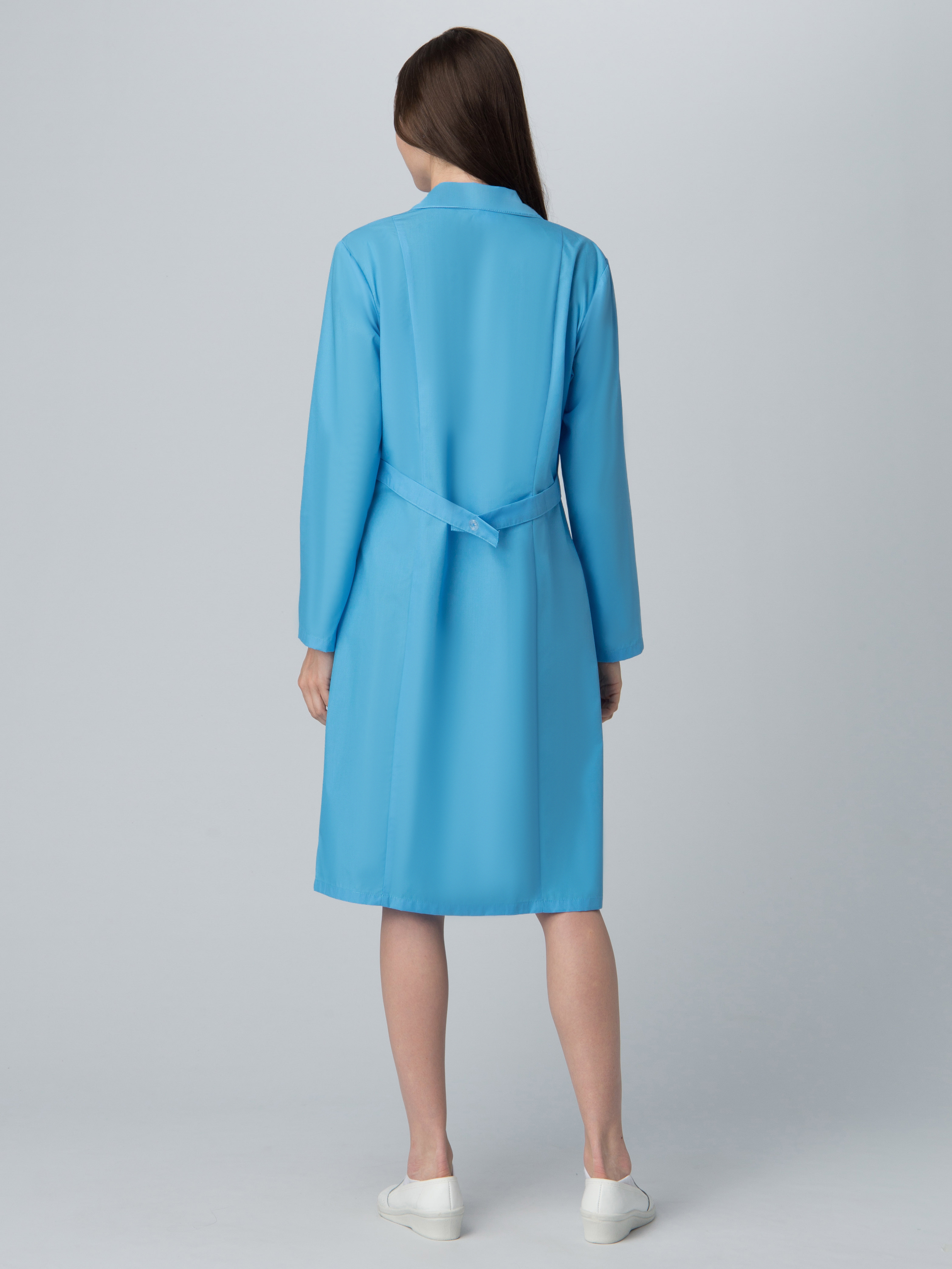 Халат прямого силуэта, длина ниже колена. Центральная застежка на пуговицы (открытая). Втачной длинный рукав с манжетами на петле/пуговице. Отложной «английский» воротник. Боковые вместительные карманы и нагрудный уменьшенный карман. Регулировка объема по талии вшивным поясом на пуговице.