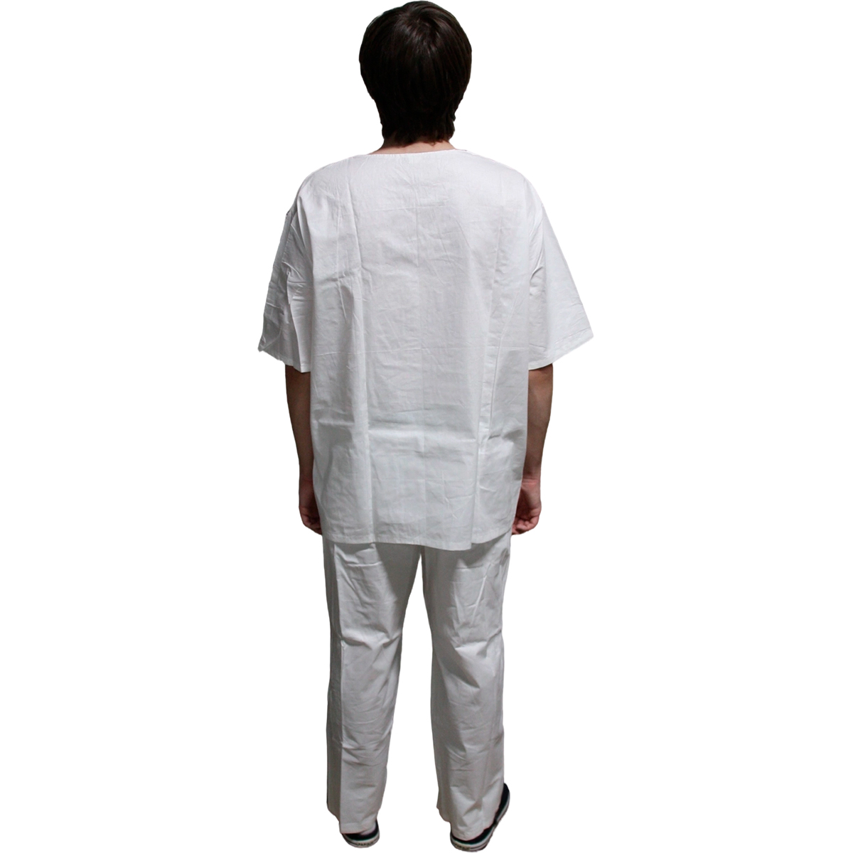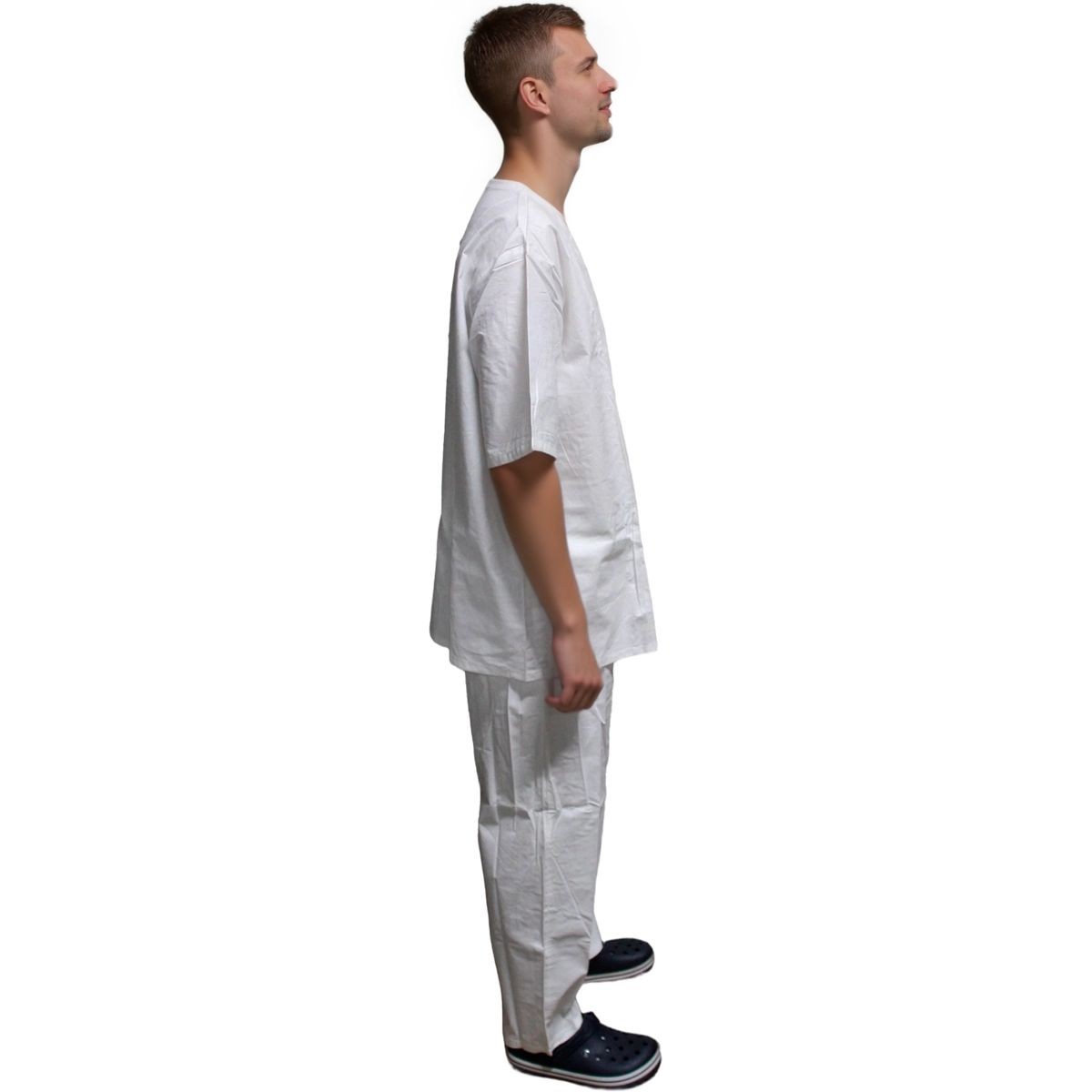 Костюм летний пекаря — это простая и удобная рабочая одежда, выполненная из легкой ткани, идеально подходящая для жаркого времени года. Костюм состоит из футболки с V-образным вырезом и прямых брюк белого цвета, предоставляя максимальный комфорт и свободу движений.