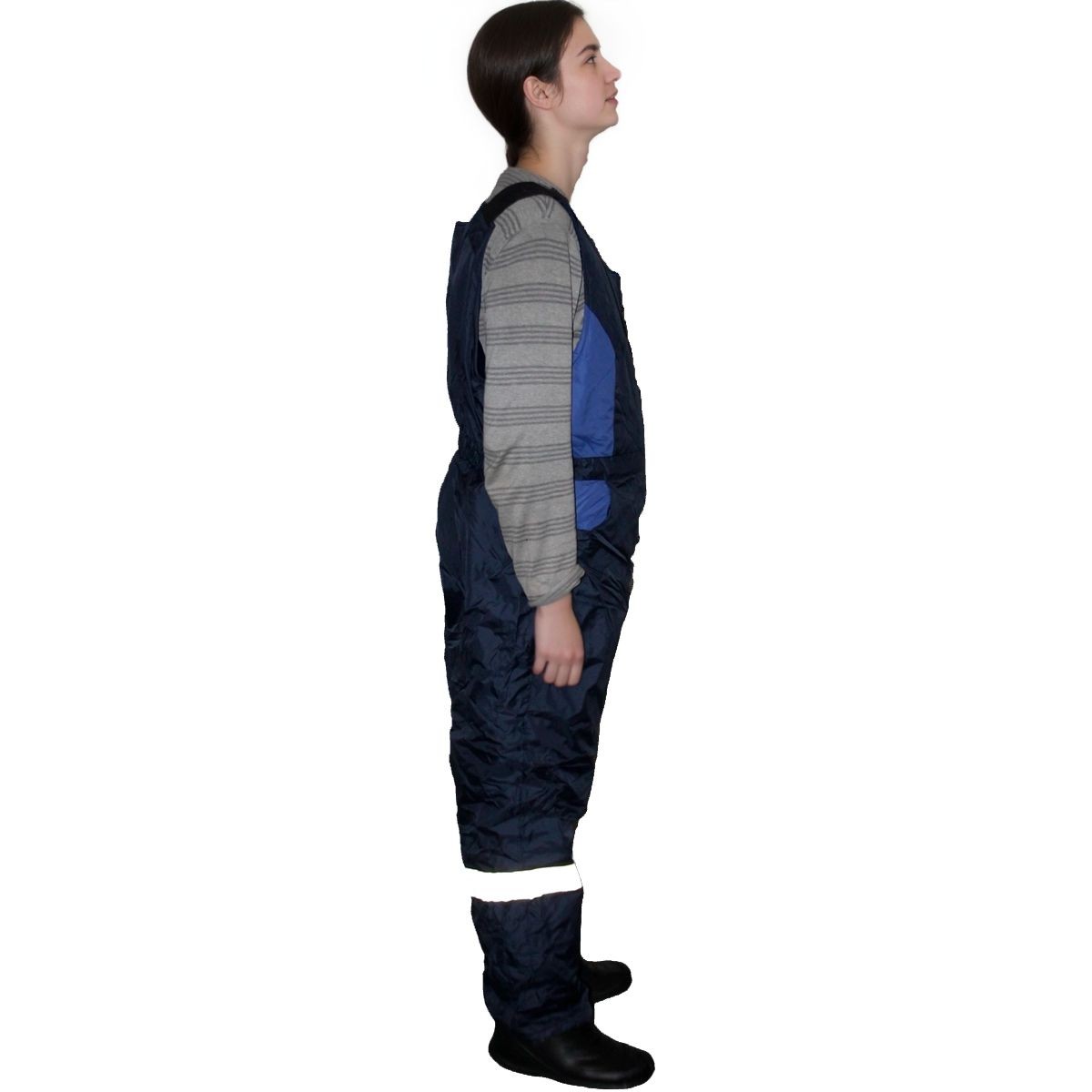 На передних половинках полукомбинезона накладные карманы и наколенники.