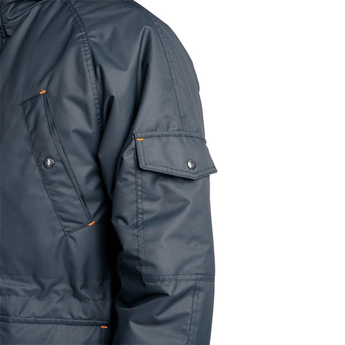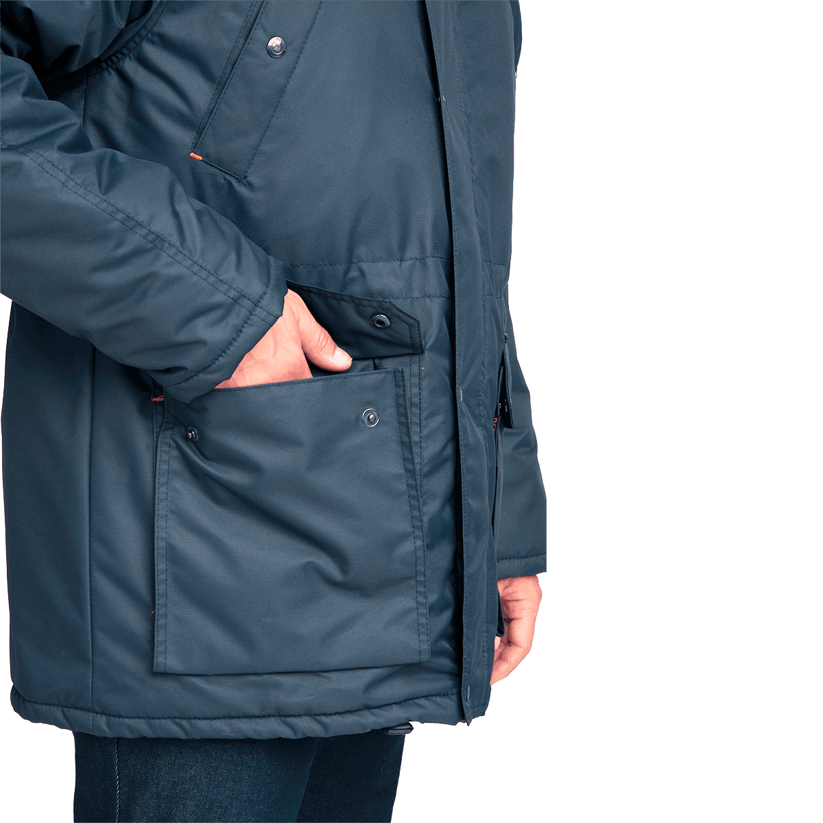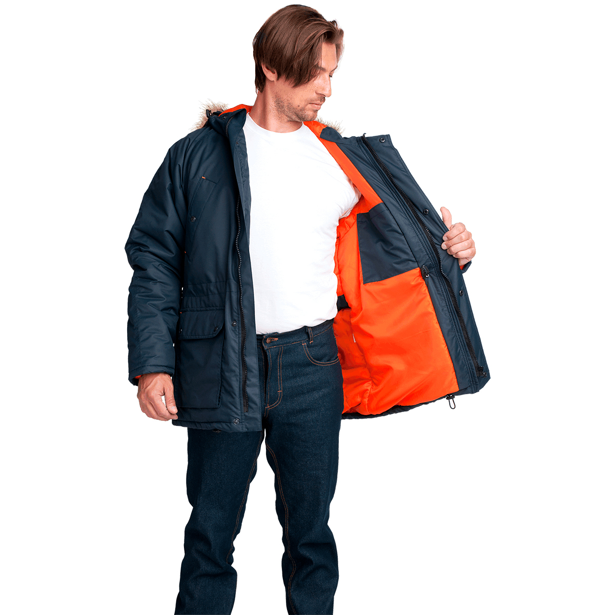 Прямого силуэта, с центральной застёжкой на тесьму «молния». Утеплённый ветрозащитный клапан на ленте «контакт» и внутренняя ветрозащитная планка обеспечивают дополнительную защиту.