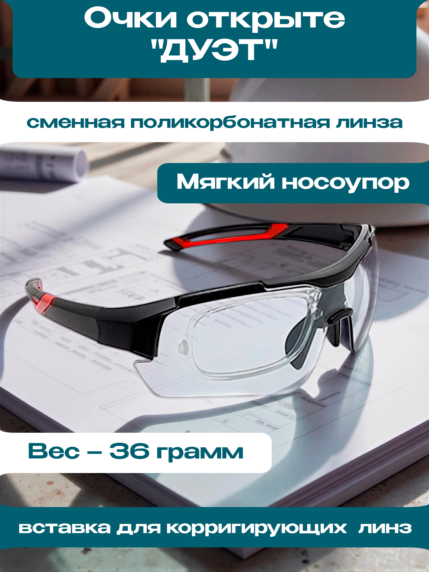 Очки изготовлены из прочного и лёгкого поликарбоната, обеспечивающего прозрачность и устойчивость к механическим воздействиям