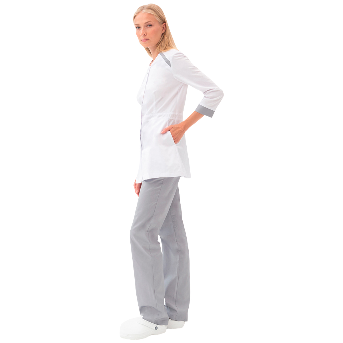 Костюм женский "Мираж" в белом и светло-сером цветах выполнен из ткани "Оптима", обеспечивающей комфорт и долговечность при длительном ношении. Этот костюм сочетает элегантность и функциональность, идеально подходя для работы в производственных и офисных условиях.
