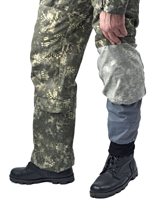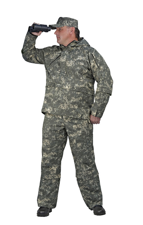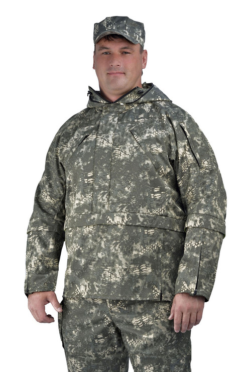 Конструкция: Капюшон сложной конструкции с противомоскитной сеткой (убирается в карман), карманы с наклонным входом на молнии, трикотажные манжеты в рукавах, пояс брюк на резинке со шлевками и пуфта для регулировки посадки.
