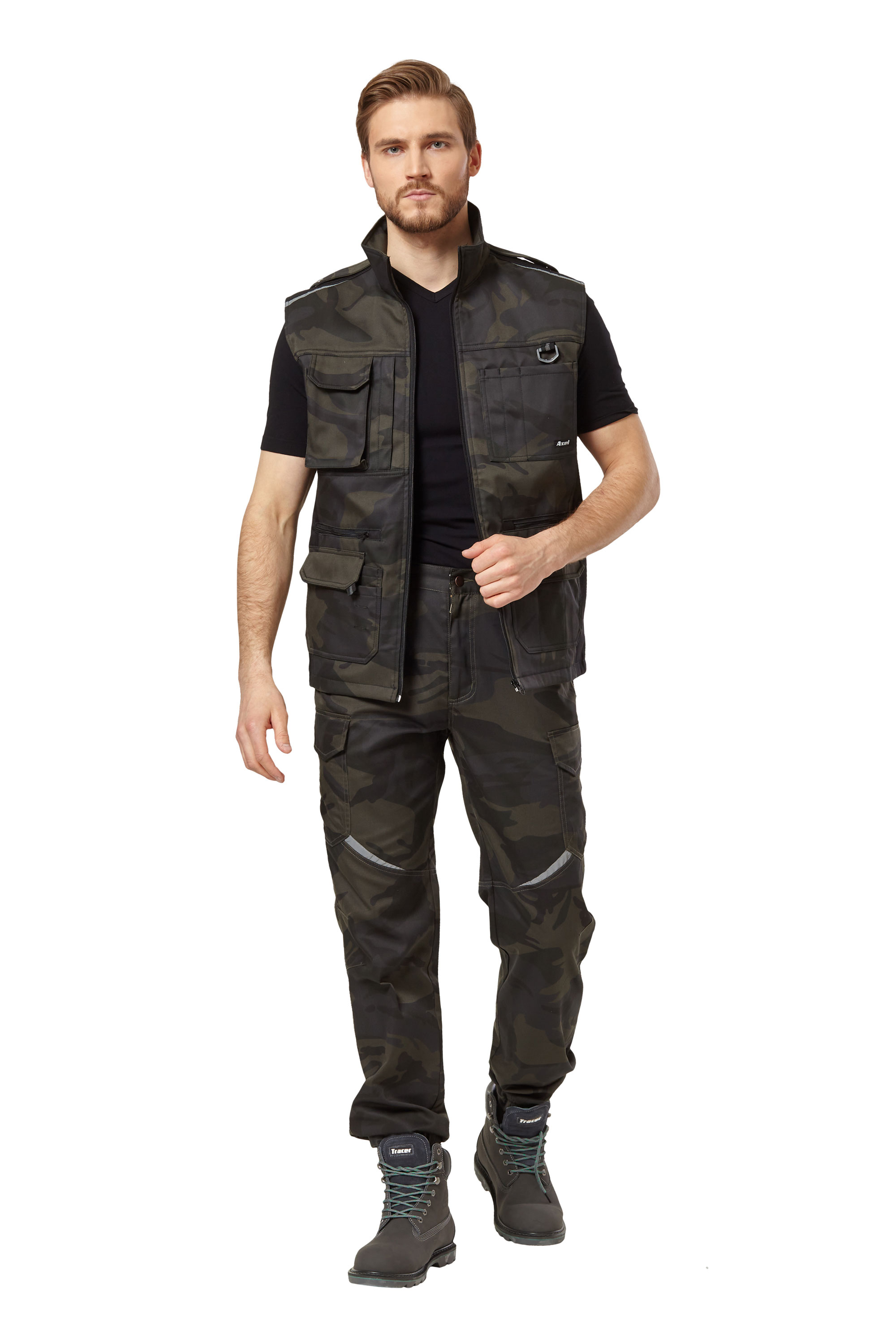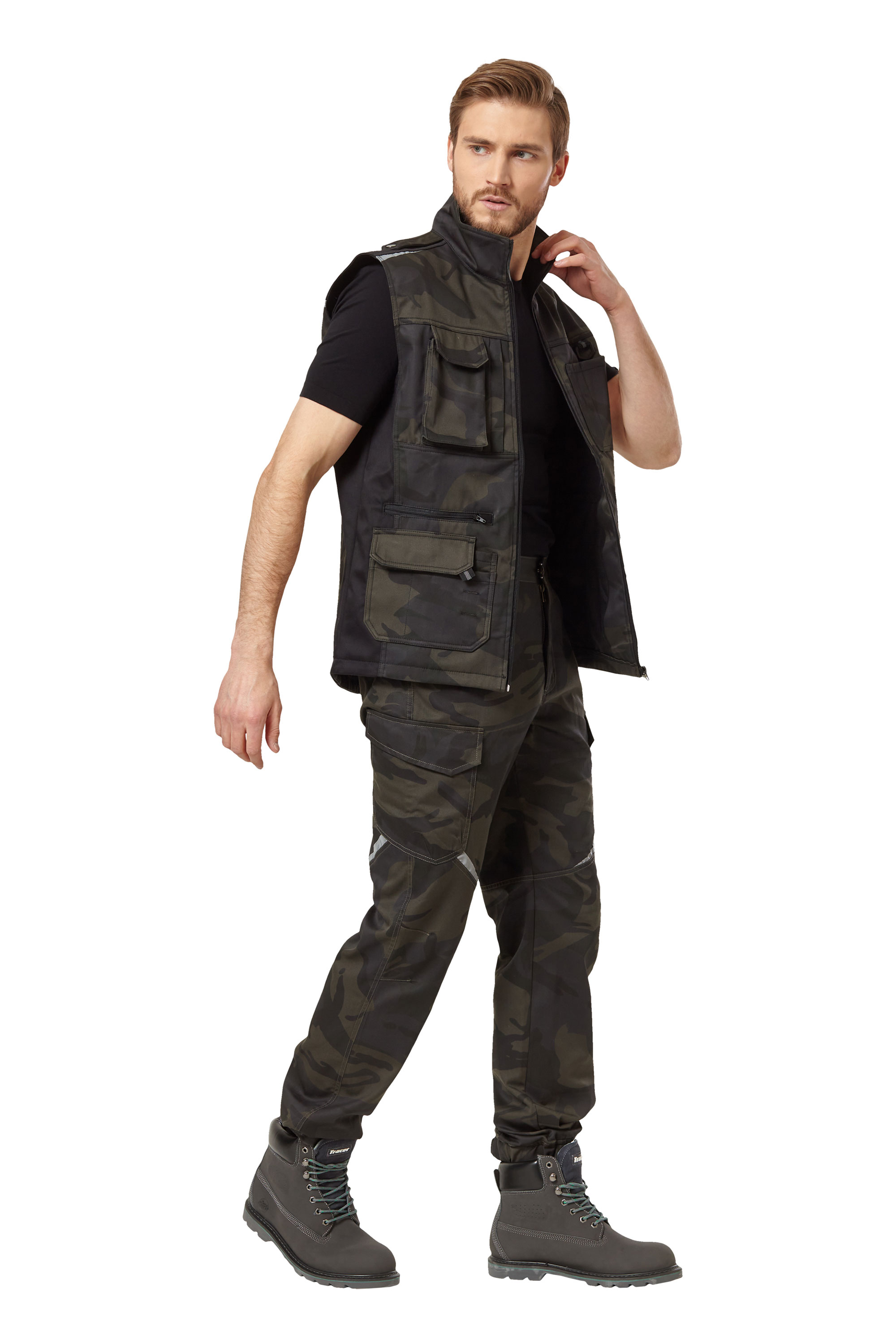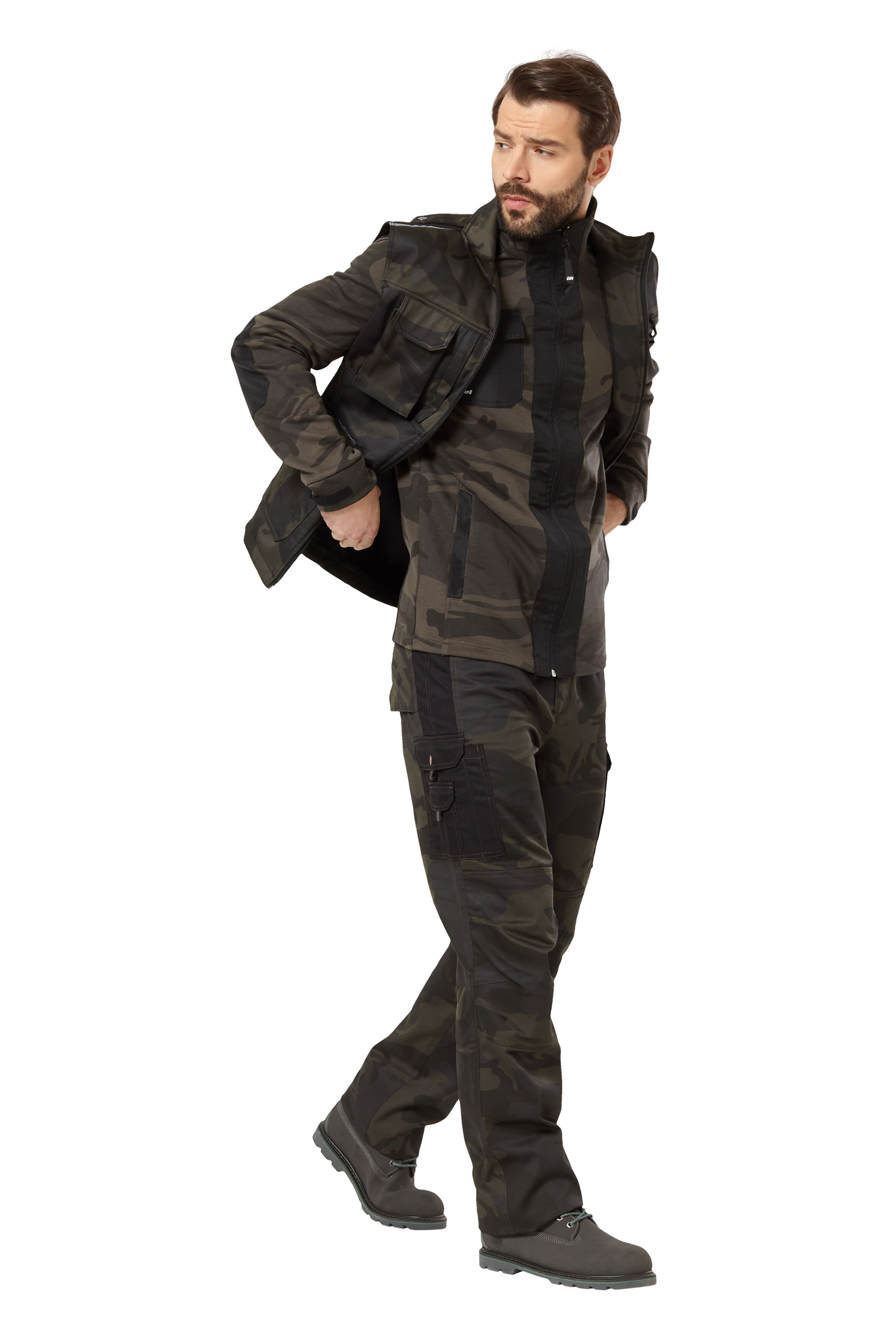 • Карманы: нагрудный левый с отделениями для канцелярии; правый для телефона с клапаном с застежкой на контактную ленту и на молнии; два нижних накладных кармана с отделениями с клапанами с застежкой на контактную ленту, два на молнии