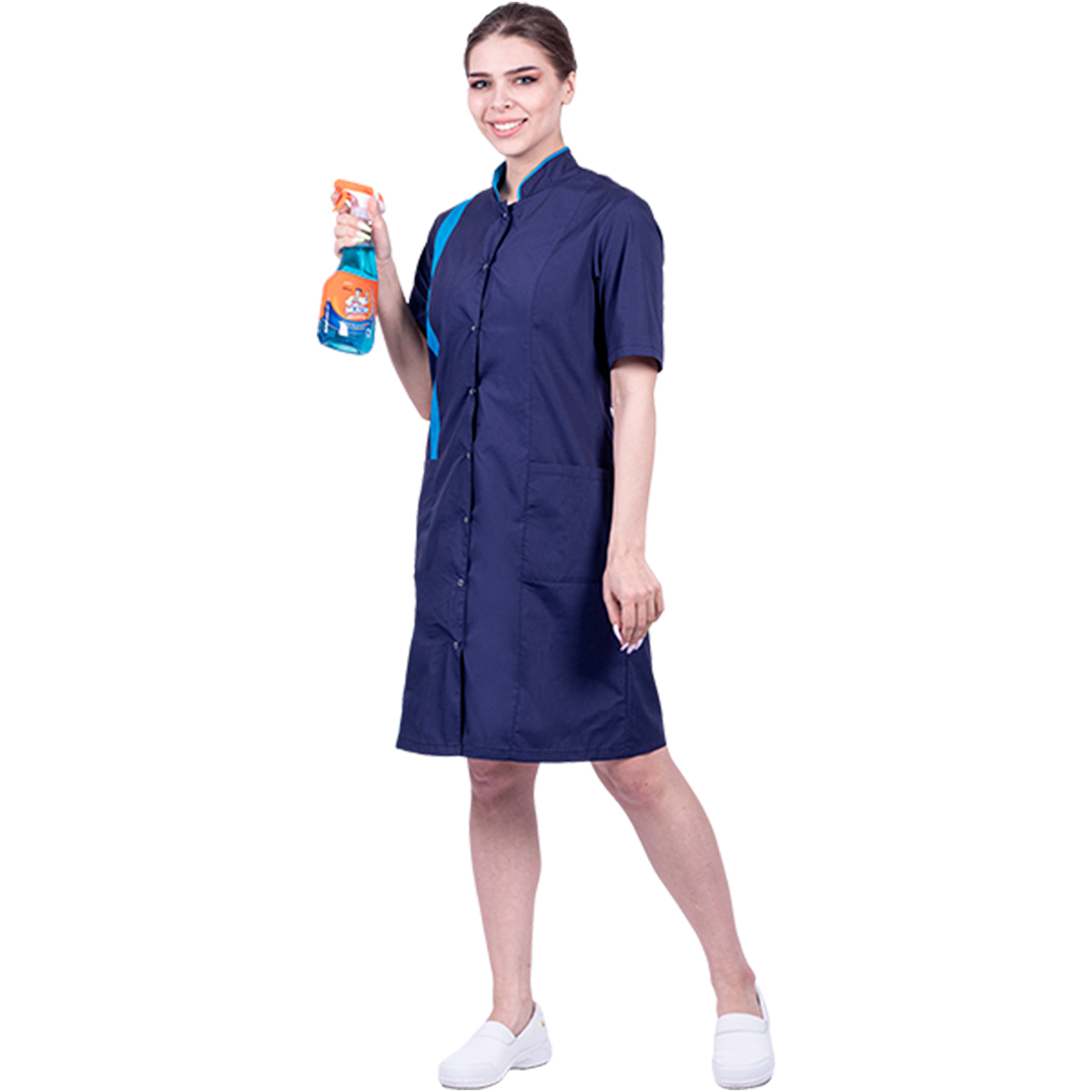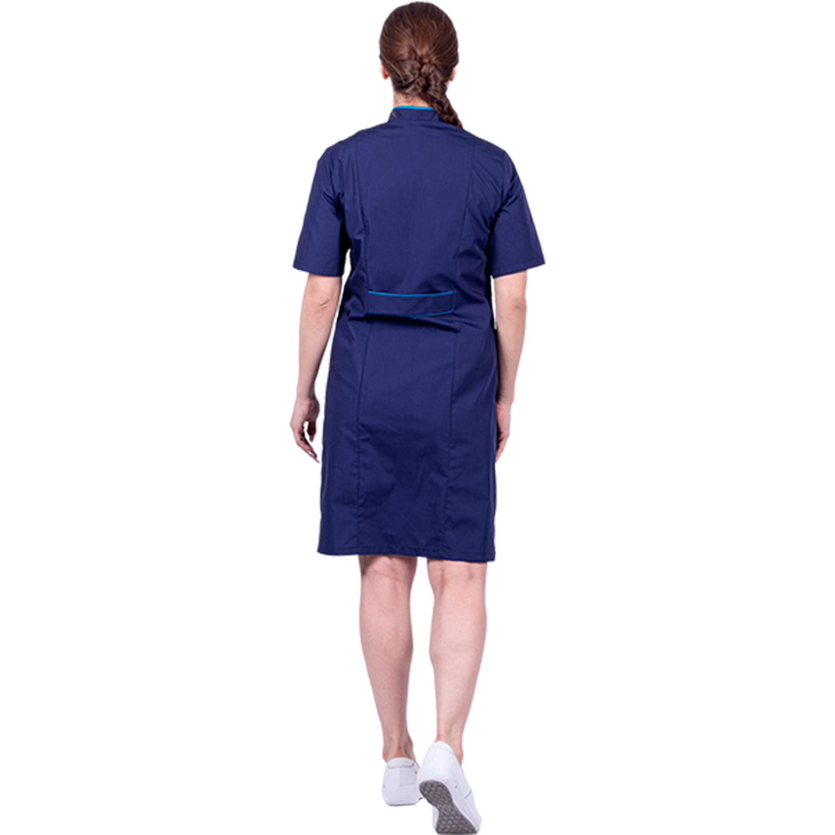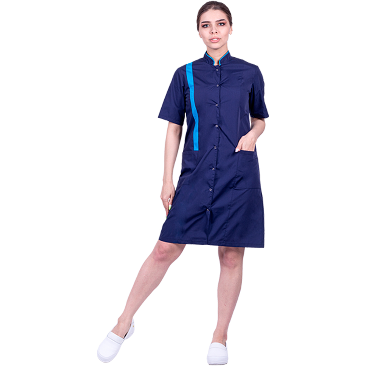 Халат полуприлегающего силуэта. Центральная застежка на кнопках по всей длине. Воротник-стойка с нижней частью из отделочной ткани (голубой). Рельефные швы от плеча на полочках и спинке. Декоративная вставка контрастного цвета по всей длине правого рельефа. Накладные карманы.