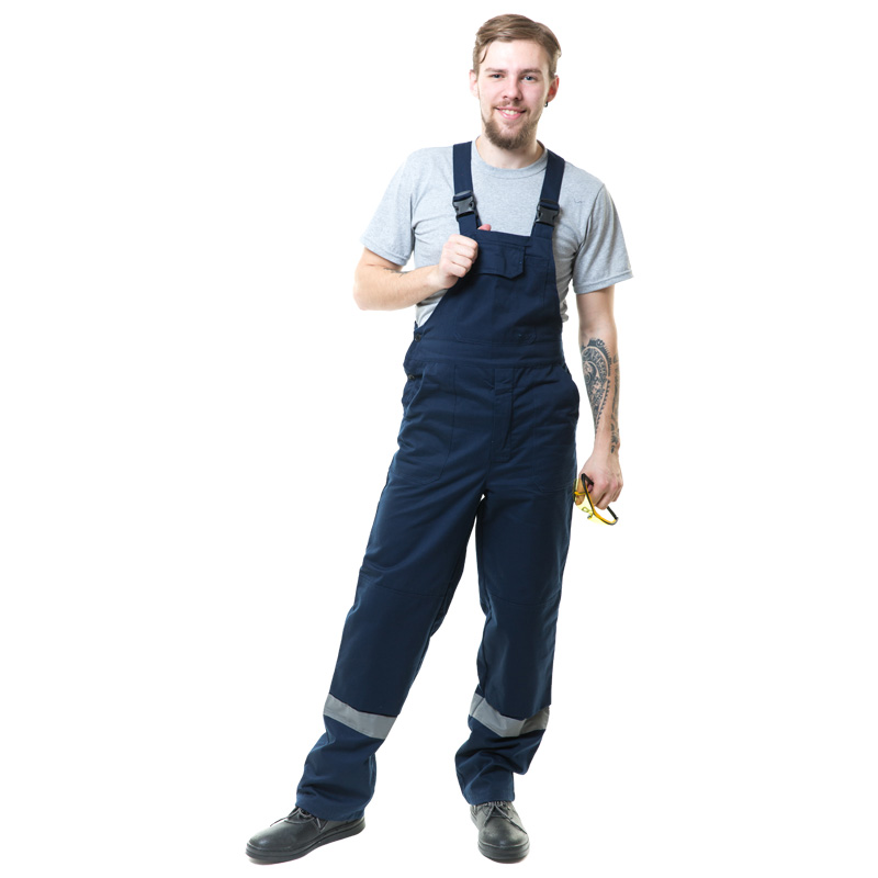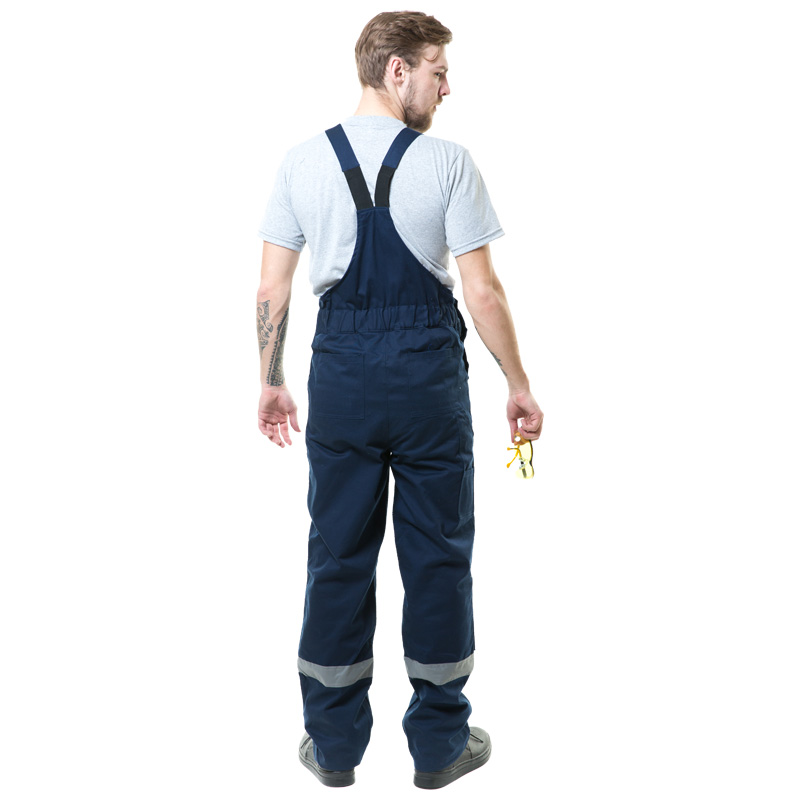 ПОЛУКОМБИНЕЗОН: притачные полочка, пояс и спинка, центральная застёжка на пуговицы и боковая на пуговицу, боковые накладные карманы с наклонным входом, два задних накладных кармана, карман для инструментов, наколенники с отлетным нижним срезом, СОП 50 мм под наколенниками и по низу задних половинок.