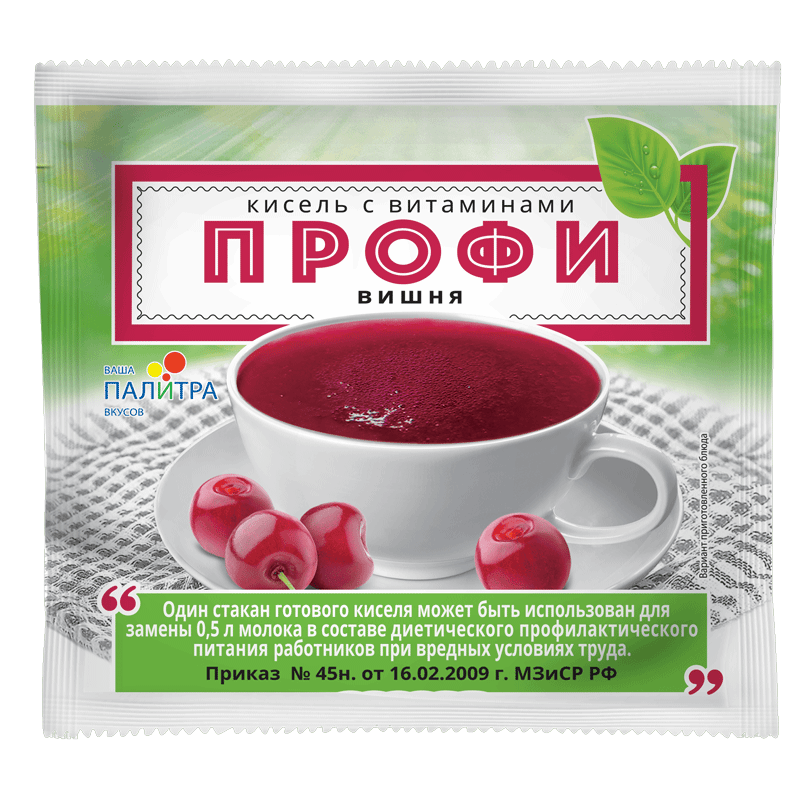 Кисели "Профи" – специализированные продукты диетического (профилактического) питания для персонала, работающего во вредных условиях, в условиях повышенной ответственности, интенсивной физической и умственной нагрузки. Могут использоваться для замены молока и пектинопрофилактики. Одна порция киселя заменяет 0,5 л молока в смену.
