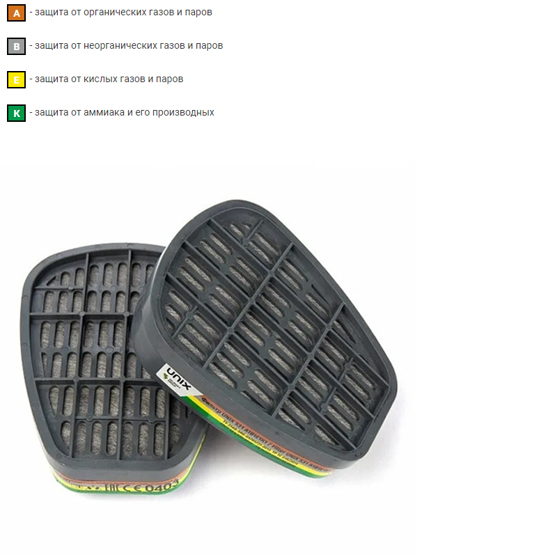 • Обеспечивает защиту от органических, неорганических и кислых газов и паров, а также аммиака и его производных.