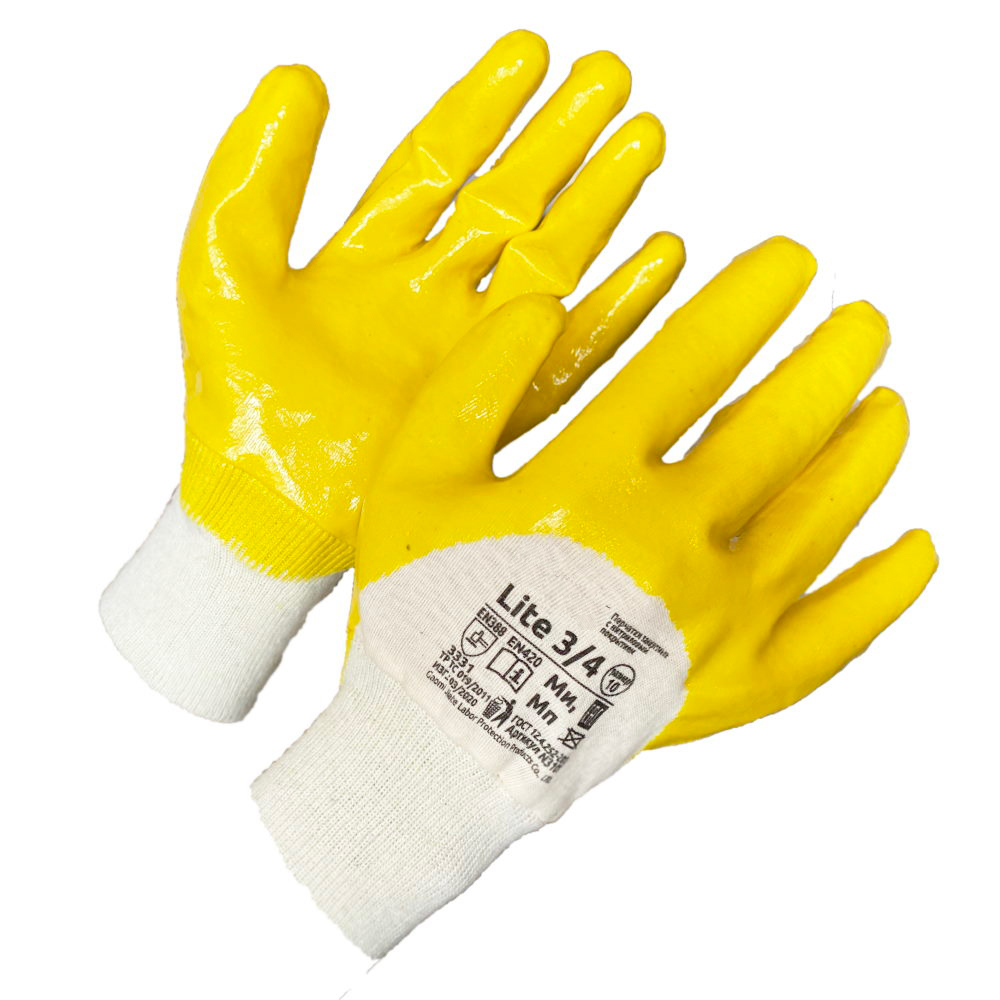 Трикотажные перчатки на плотной основе интерлок, покрытые в один слой жёлтым нитрилом премиум-качества на три четверти - закрыты пальцы, ладонь и тыльная сторона ладони по костяшки.